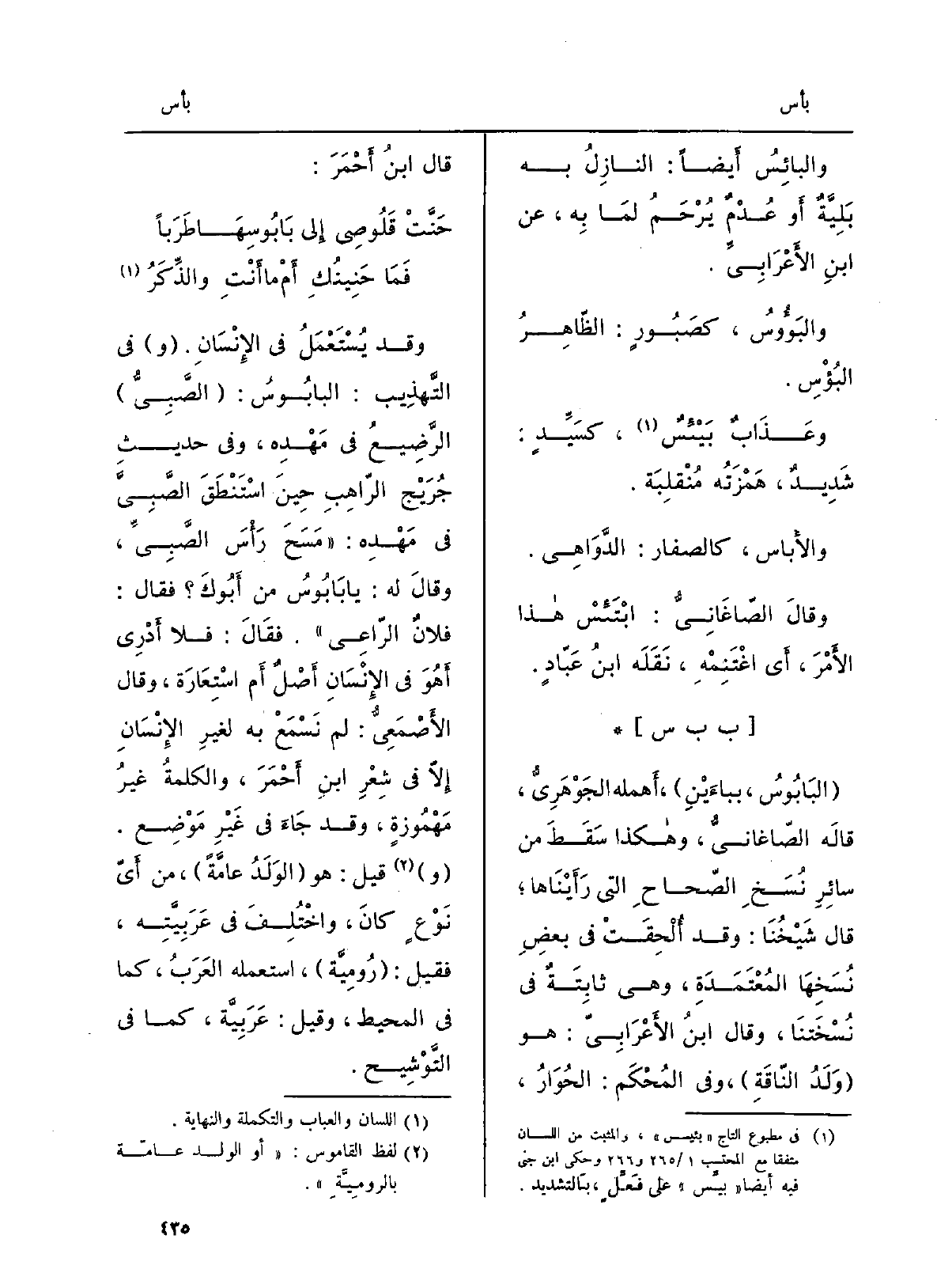 وَقد يُستعمَلُ فِي الْإِنْسَان. فِي التَّهْذِيب:} البابُوس: الصبيُّ الرَّضيعُ فِي مَهْدِه، وقِي حَدِيث جُرَيْج الرَّاهِبِ حِين اسْتَنْطَقَ الصَّبِيَّ فِي مَهدِه: مَسَحَ رأسَ الصبيِّ، وَقَالَ لَهُ: يَا! بابُوسُ من أَبوك فَقَالَ: فلانٌ الرَّاعِي. فَقَالَ: فَلَا أَدْرِي أهوَ فِي الإنسانِ أصلٌ أم استِعارة، وَقَالَ الأَصْمَعِيّ: لم نَسْمَعْ بِهِ لغيرِ الإنسانِ إلاّ فِي شِعرِ ابنِ أَحْمَرَ، والكلمةُ غيرُ مَهْمُوزةٍ، وَقد جاءَ فِي غيرِ مَوْضِع. قيل: هُوَ الولَدُ عامَّةً، من أيِّ نَوْعٍ كَانَ، واختُلِفَ فِي عَرَبِيَّتِه، فَقيل: رُوميَّة، اسْتَعْملهُ العربُ، كَمَا فِي الْمُحِيط، وَقيل: عربيَّة، كَمَا فِي التَّوْشيح.