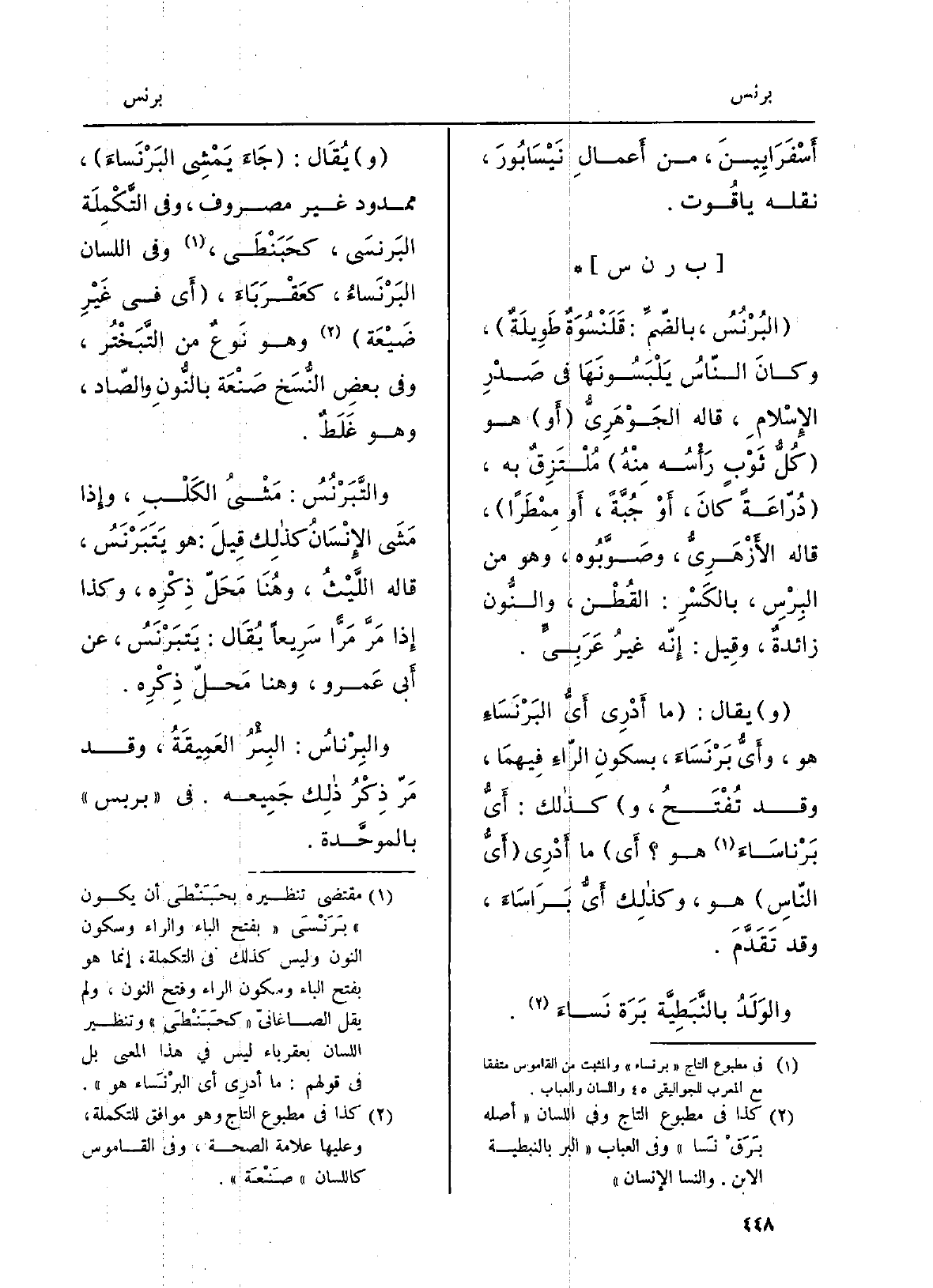 البُرْنُسُ، بالضمِّ، قَلَنْسَوَةٌ طويلَةٌ، وَكَانَ الناسُ يَلبَسونَها فِي صَدر الْإِسْلَام، قَالَه الجَوْهَرِيّ. أَو هُوَ كلُّ ثَوبٍ رأْسُه مِنْهُ مُلْتَزِقٌ بِهِ، دُرَّاعَةً كانَ، أَو جُبَّةً، أَو مِمْطَراً، قَالَه الأَزْهَرِيُّ، وصَوَّبوه، وَهُوَ من البِرْسِ، بالكسْرِ: القُطْنُ، والنُّونُ زائدَةٌ، وَقيل: إنَّه غيرُ عَرَبيٍّ. يُقال: مَا أَدري أَيُّ البَرْنَساءِ هُوَ، وأَيُّ بَرْنَساءَ، بِسُكُون الرَّاءِ فيهمَا، وَقد تُفتَحُ، كَذَلِك أَيُّ برْناساءَ هُوَ أَي مَا أَدري أَيُّ الناسِ هُوَ، وَكَذَلِكَ أَيُّ بَراساءَ، وَقد تقدَّمَ. والوَلَدُ بالنَّبَطِيَّة بَرَة نَساءَ. يُقَال: جَاءَ يَمشي البَرْنَساءَ، مَمْدُود غير مَصروف، وَفِي التكملة البَرنسَى كحَبَنْطَى، وَفِي اللِّسَان البَرْنَساءُ، كعَقرَباءَ، أَي فِي غيرِ ضَيعَة، وَهُوَ نوعٌ من التَّبَخْتُر، وَفِي بعض النُّسَخ صَنعة بالنُّون والصَّاد، وَهُوَ غَلَطٌ. والتَّبَرْنُسُ: مَشْيُ الكَلْبِ، وَإِذا مَشَى الْإِنْسَان كَذَلِك قيل: هُوَ يَتَبَرْنَسُ، قَالَه الليثُ، وَهنا مَحَلُّ ذِكرِه، وَكَذَا إِذا مَرَّ مَرَّاً سَرِيعا يُقَال: يَتَبَرْنَسُ، عَن أَبي عَمرو، وَهنا مَحلّ ذكره.