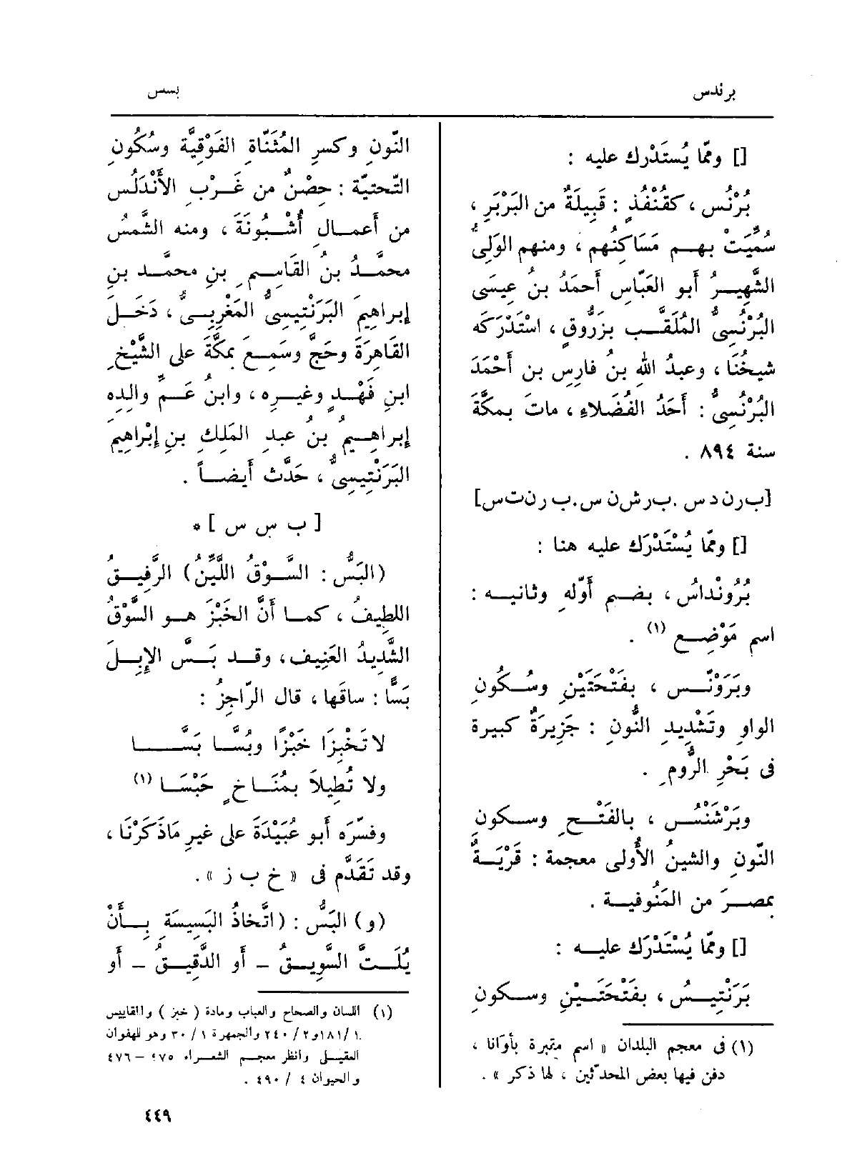 وَمِمَّا يستدرَك عَلَيْهِ هُنَا: بُرُونْداسُ، بضَمِّ أَوَّلهِ وثانيه: اسْم مَوضِع. وبَرَوْنّس، بِفتْحَتَيْنِ وسُكونِ الواوِ وَتَشْديد النُّونِ: جزيرةٌ كبيرةٌ فِي بحرِ الرُّوم. وبَرْشَنْسُ بِالْفَتْح وسكونِ النُّونِ والشِّينُ الأُولى معجَمة: قريَةٌ بمِصرَ من المَنوفِيَّة. وَمِمَّا يُستدرك عَلَيْهِ: بَرَنْتِيسُ، بفتحَتينِ وسكونِ النُّون وكَسْر المُثَنَّاةِ الفَوقِيَّة وَسُكُون التَّحتِيَّة: حِصْنٌ من غربِ الأَندلُسِ من أَعمالِ أُشْبُونَةَ، وَمِنْه الشَّمسُ مُحَمَّد بنُ القاسِمِ بنِ مُحَمَّد بنِ إبراهيمَ البَرَنْتيسيُّ المَغرِبِيُّ، دخَلَ القاهِرَةَ وحَجَّ وسَمعَ بمَكّةَ على الشَّيخِ ابنِ فهدٍ وغيرِه، وابنُ عَمِّ والدِه إبراهيمُ بنُ عبدِ الملِكِ بنِ إبراهيمَ البَرَنْتيسِيُّ، حدَّثَ أَيضاً.