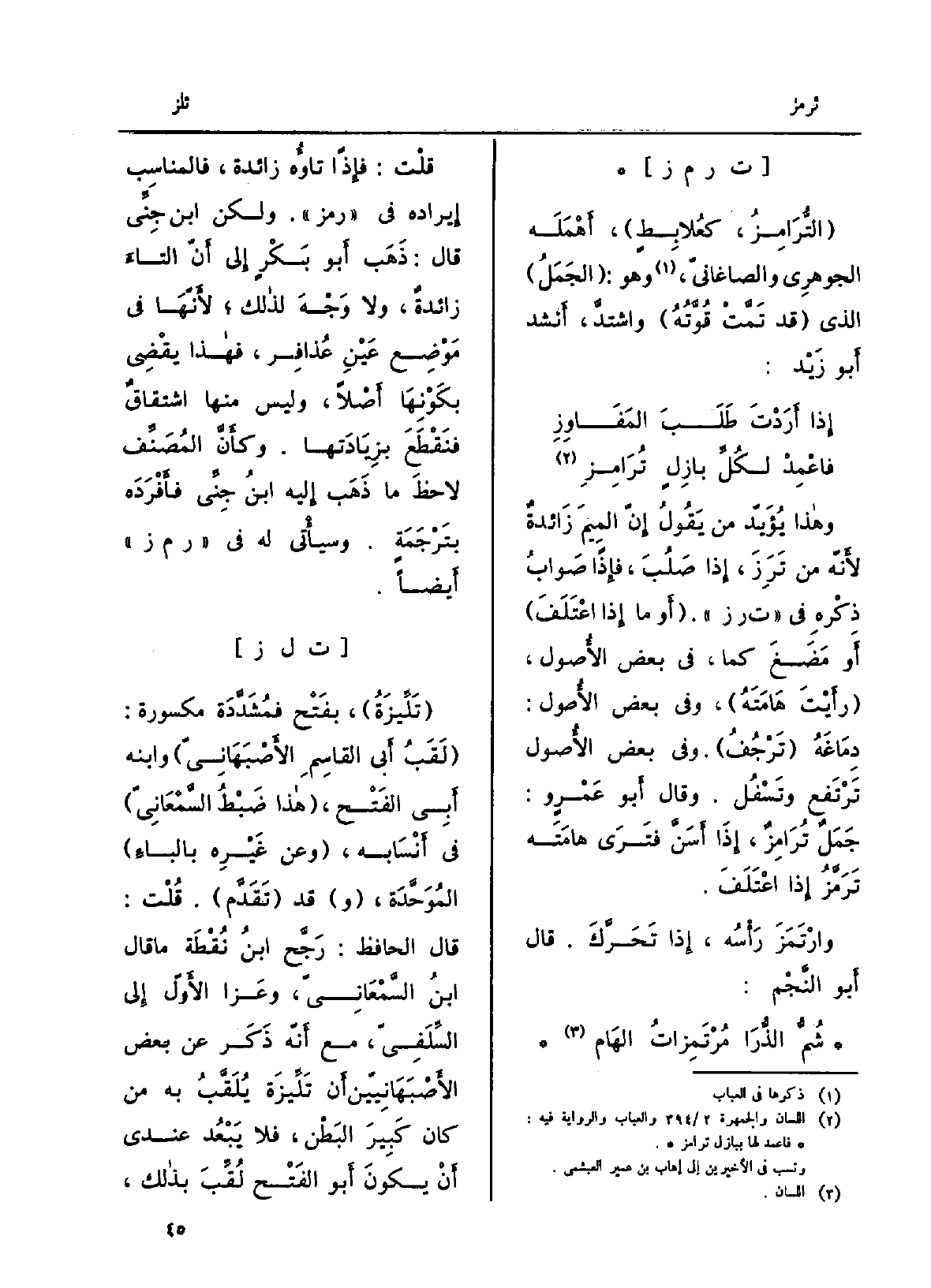 وَهَذَا يُؤَيِّدُ من يقولُ إنّ الْمِيم زائدةٌ لأنّه من تَرِزَ، إِذا صَلُبَ، فَإِذا صوابُ ذِكرِه فِي ترز.