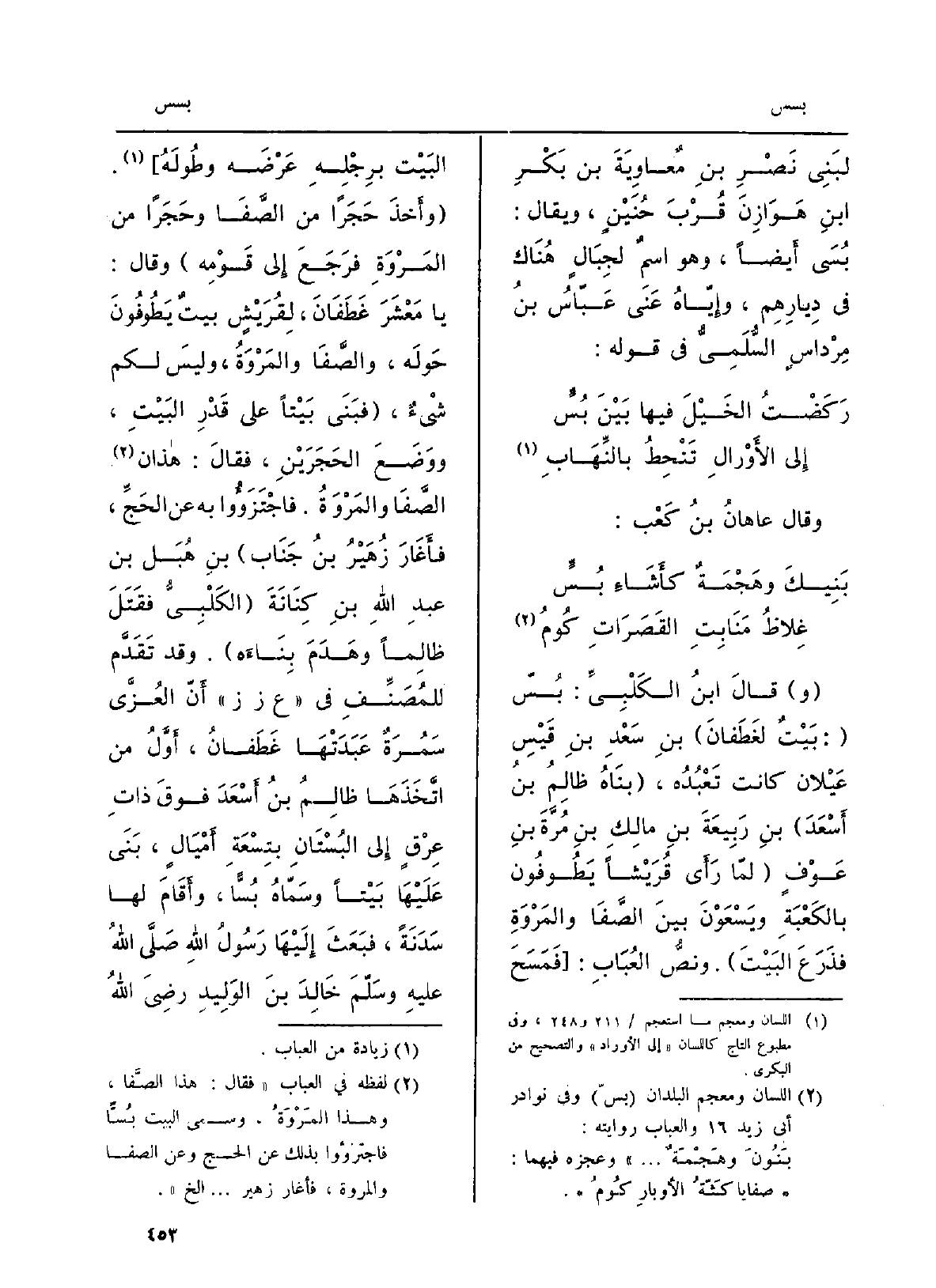 قَالَ ابنُ الكَلبيِّ:} بُسّ: بيتٌ لغَطَفانَ بنِ سَعْدِ بن قَيْسِ عَيْلان كَانَت تَعْبُده، بناهُ ظالِمُ بنُ أَسْعَدَ بنِ رَبيعةَ بنِ مالِكِ بنِ مُرَّةَ بنِ عَوْفٍ لمّا رأى قُرَيْشاً يَطوفون بالكَعبة ويَسْعَون بَين الصَّفا والمَرْوةِ فَذَرَع البيتَ. ونصُّ العُباب: فَمَسَح الْبَيْت برِجْلِه عَرْضَه وطُولَه. وَأخذ حَجَرَاً من الصَّفا وَحَجَراً من المَروَةِ فَرَجَع إِلَى قَوْمِه وَقَالَ: يَا مَعْشَرَ غَطَفَانَ، لقُرَيشٍ بيتٌ يطوفونَ حَوْلَه، والصَّفا والمَروةُ، وَلَيْسَ لكم شيءٌ، فَبنى بَيْتا على قَدْرِ الْبَيْت، وَوَضَع الحجَرَيْنِ، فَقَالَ: هَذَانِ الصَّفا والمَروَة. فاجْتَزَؤُوا بِهِ عَن الحَجّ، فأغارَ زُهَيْرُ بنُ جَنَاب بنِ هُبَل بن عَبْد الله بنِ كِنانةَ الكلبيُّ فَقَتَل ظالِماً وَهَدَمَ بِناءَه، وَقد تقدّمَ للمُصنِّفِ فِي عزز أنّ العُزَّى سَمُرَةٌ عَبَدَتْها غَطَفَانُ، أوّلُ من اتَّخذَها ظالمُ بنُ أَسْعَدَ فوقَ ذاتِ عِرْقٍ إِلَى البُسْتان بتِسعةِ أَمْيَالٍ، بنى عَلَيْهَا بَيْتَاً وسَمّاهُ! بُسَّاً، وأقامَ لَهَا سَدَنَةً، فَيَعَث إِلَيْهَا رسولُ الله صلّى الله عَلَيْهِ وسلَّم خالدَ بنَ الْوَلِيد رَضِي الله