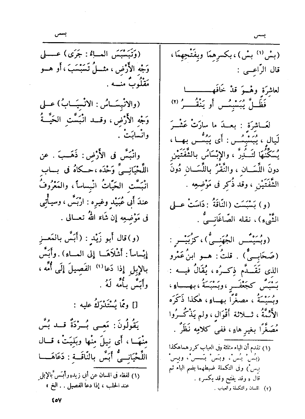 لعاشِرَةٍ: بعدَ مَا سارَتْ عَشْرَ لَيالٍ، {يُبَسْبِسُ: أَي} يَبُسُّ بهَا، يُسَكِّنُها لتَدُرَّ، والإبْساسُ بالشَّفَتَيْنِ دونَ اللِّسان، والنَّقْرُ باللسانِ دونَ الشفتَيْن، وَقد ذُكِرَ فِي مَوْضِعه. {بَسْبَسَت الناقةُ: داستْ على الشيءِ، نَقله الصَّاغانِيّ.} وبُسَيْسٌ الجُهَنيُّ، كزُبَيْرٍ: صحابيٌّ. قلتُ: هُوَ ابنُ عَمْرو الَّذِي تقدّم ذِكرُه، يُقَال فِيهِ: {بَسْبَسٌ كَجَعْفَرٍ،} وبَسْبَسَةُ، بهاءٍ، {وبُسَيْسَةُ، مصغَّراً بهاءٍ، هَكَذَا ذَكَرَه الأئمَّةُ، ثَلَاثَة أقوالٍ، وَلم يَذْكُروا مُصَغَّراً بغيرِ هاءٍ، فَفِي كلامِه نظَرٌ.} وتَبَسْبَسَ الماءُ: جرى على وَجْهِ الأَرْض، مثل تَسَبْسَبَ، أَو هُوَ مقلوبٌ مِنْهُ. {والانْبِساسُ: الانْسِيابُ على وَجْهِ الأَرْض، وَقد انْبَسَّتِ الحَيَّةُ وانْسابَتْ.} وانْبَسَّ فِي الأَرْض: ذَهَبَ. عَن اللِّحْيانيِّ وَحْدَه، حكاهُ فِي بَاب {انْبَسَّتِ الحَيّاتُ} انْبِساساً، والمعروفُ عِنْد أبي عُبَيْدٍ وغيرِه: ارْبَسَّ، وَسَيَأْتِي فِي مَوْضِعه إِن شَاءَ اللهُ تَعَالَى. قَالَ أَبُو زَيْدٍ: {أَبَسَّ بالمَعزِ} إبْساساً: أَشْلاها إِلَى المَاء. وأَبَسَّ بالإبلِ إِذا دَعا الفَصيلَ إِلَى أُمِّه، {وأَبَسَّ بأُمِّه لَهُ. ومِمّا يُسْتَدْرَك عَلَيْهِ: يَقُولُونَ: مَعِيَ بُرْدَةٌ قد} بُسَّ مِنْهَا، أَي نِيلَ مِنْهَا وبَلِيَتْ، قَالَ اللِّحْيانيُّ! أَبَسَّ بالناقةِ: دَعاها