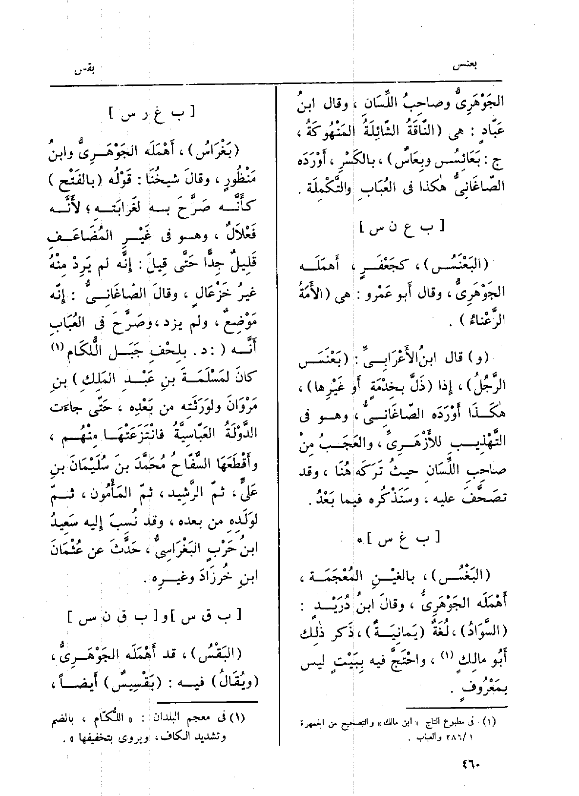 البَغْس، بالغَين المُعجمَة، أهمله الجَوْهَرِيّ، وَقَالَ ابنُ دُرَيْدٍ: السَّواد، لغةٌ يَمانِيَةٌ، ذكر ذَلِك أَبُو مالكٍ، واحتجَّ فِيهِ ببيتٍ لَيْسَ بمعروفٍ.