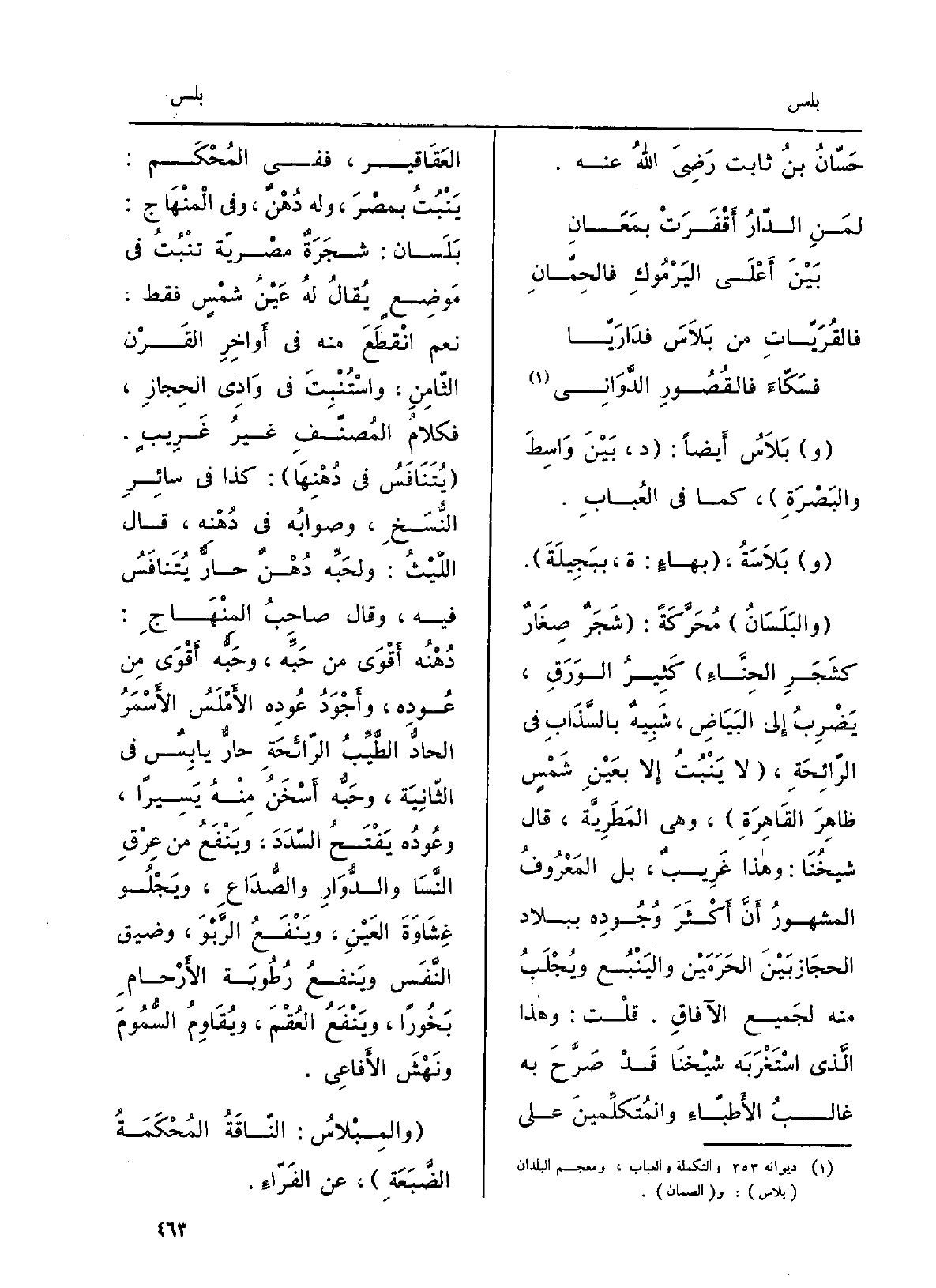 بَلاَسُ أَيْضا: د، بَين واسِطَ والبَصْرة، كَمَا فِي العُباب. بَلاَسَةُ، بهاءٍ: ة، ببَجِيلَة. والبَلَسان مُحرّكةً: شجَرٌ صِغارٌ كَشَجَرِ الحِنّاءِ كثيرُ الورَقِ، يَضْرِبُ إِلَى البَياض، شَبيهٌ بالسَّذابِ فِي الرَّائِحَة، لَا يَنْبُتُ إلاّ بعَينِ شَمسٍ ظاهِرَ الْقَاهِرَة، وَهِي المَطَرِيَّة، قَالَ شَيْخُنا: وَهَذَا غريبٌ، بل الْمَعْرُوف المشهورُ أنّ أَكْثَرَ وُجودِه بِبِلَاد الْحجاز بَين الحرمَيْن واليَنبُع ويُجلَبُ مِنْهُ لجَمِيع الْآفَاق. قلت: وَهَذَا الَّذِي استغربَه شَيْخُنا قد صرَّحَ بِهِ غالبُ الأطبّاءِ والمُتكَلِّمينَ على العَقاقير، فَفِي المُحكَم: يَنْبُتُ بمِصر، وَله دُهْنٌ، وَفِي الْمِنْهَاج: بَلَسان: شَجَرَةٌ مصريّة تَنْبُتُ فِي مَوْضِعٍ يُقَال لَهُ عينُ شَمسٍ فَقَط، نعم انْقطعَ مِنْهُ فِي أواخرِ القَرن الثَّامِن، واسْتُنبِتَ فِي وَادي الْحجاز، فكلامُ المُصَنِّف غيرُ غريبٍ. يُتنافَسُ فِي دُهنِها: كَذَا فِي سَائِر النُّسَخ، وصوابُه فِي دُهنِه، قَالَ اللَّيْث: ولحَبِّه دُهْنٌ حارٌّ يُتنافَسُ فِيهِ، وَقَالَ صاحبُ المِنهاج: دُهنُه أَقْوَى من حَبِّه، وحَبُّه أقوى من عُودِه، وأَجْوَدُ عُودِه الأملسُ الأسمرُ الحادُّ الطَّيِّبُ الرائحةِ حارٌّ يابِسٌ فِي الثَّانِيَة، وحَبُّه أَسْخَنُ مِنْهُ يَسيراً، وعُودُه يَفْتَحُ السَّدَدَ، ويَنْفَعُ من عِرْقِ النَّسَا والدُّوَارِ والصُّداع، ويَجلو غِشاوَةَ)