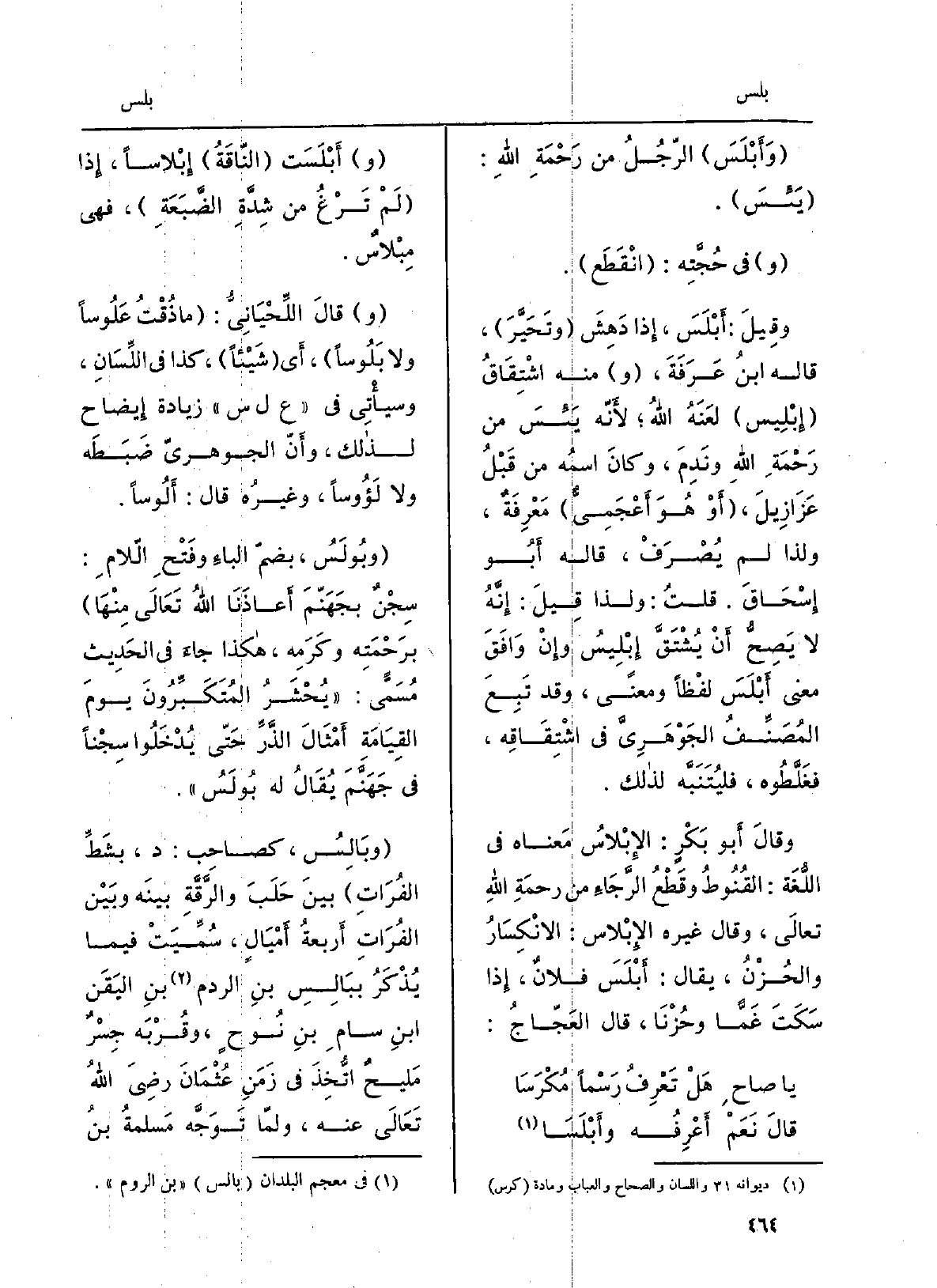 أَبْلَسَتْ الناقةُ إبْلاساً، إِذا لم تَرْغُ من شِدَّةِ الضَّبَعةِ، فَهِيَ مِبْلاس. قَالَ اللِّحْيانيُّ: مَا ذُقتُ عَلُوساً وَلَا بَلُوساً، أَي شَيْئا، كَذَا فِي اللِّسان، وَسَيَأْتِي فِي علس زِيَادَة إِيضَاح لذَلِك، وأنّ الجَوْهَرِيّ ضَبَطَه وَلَا لَؤُوساً، وغيرُه قَالَ: أَلُوساً. وبُولَس، بضمّ الباءِ وفتحِ اللَّام: سِجْنٌ بجهنَّمَ أعاذَنا اللهُ تَعَالَى مِنْهَا برحمتِه وكَرَمِه، هَكَذَا جَاءَ فِي الحَدِيث مُسمّىً: يُحشَرُ المُتَكَبِّرونَ يومَ القيامةِ أَمْثَالَ الذَّرِّ حَتَّى يُدخَلوا سِجْناً فِي جهنَّمَ يُقَال لَهُ بُولَسُ. وبالِسُ، كصاحبٍ: د، بشَطِّ الفراتِ بَين حَلَبَ والرّقَّةِ بَينه وَبَين الْفُرَات أربعةُ أَمْيَال، سُمِّيت فِيمَا يُذكَرُ ببالِسِ بنِ الرَّدْم بنِ اليَقَن بنِ سامِ بنِ نُوحٍ، وقُربَه جِسرٌ مَليحٌ اتُّخِذَ فِي زمنِ عثمانَ رَضِيَ اللهُ تَعَالَى عَنهُ، ولمّا توَجَّهَ مَسلمةُ بنُ