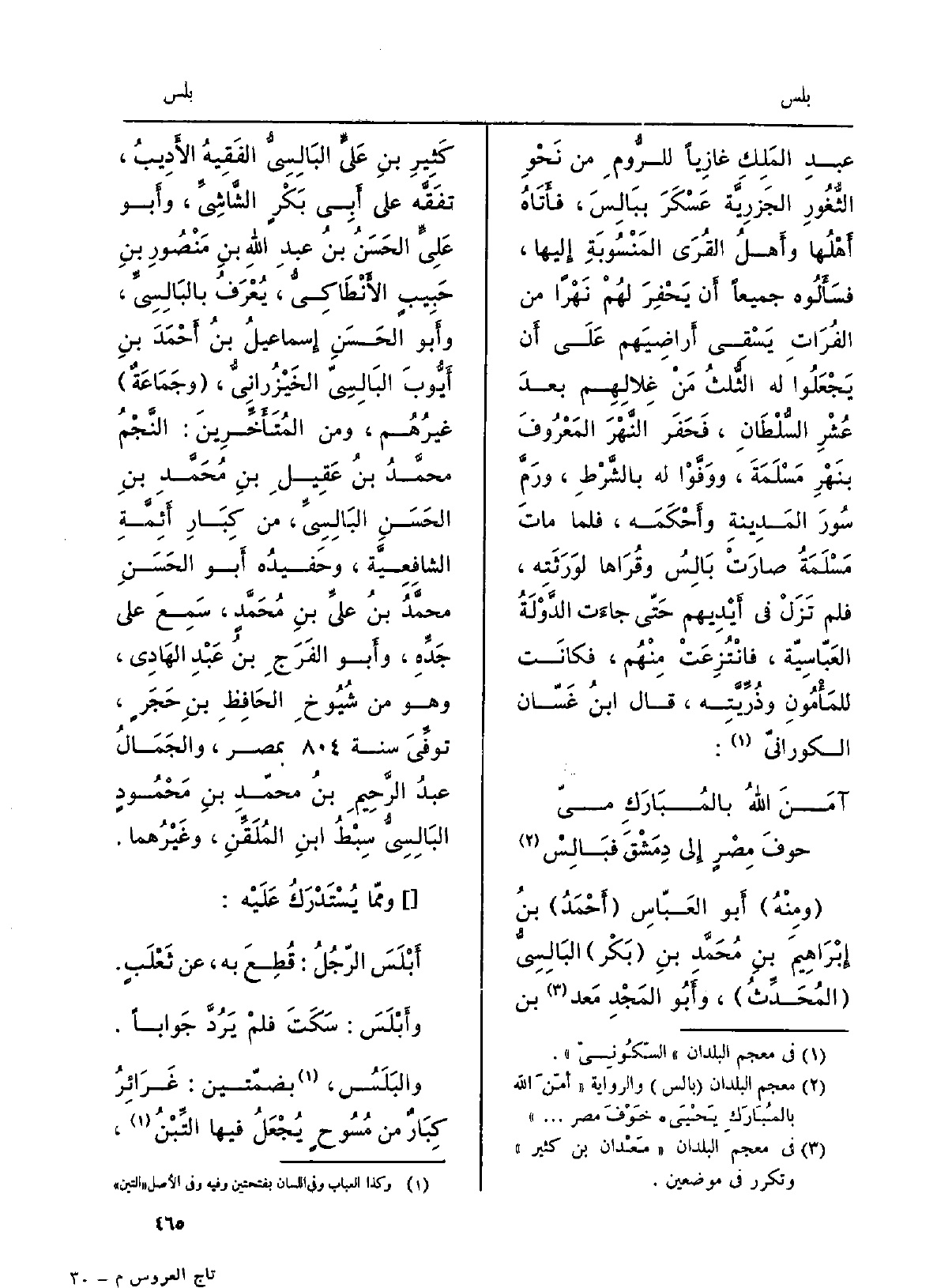 الخَيْزرانِيُّ، وجماعةٌ غيرُهم، وَمن المُتأخِّرين: النَّجْمُ مُحَمَّد بن عَقيلِ بنِ مُحَمَّد بن الْحسن البالِسِيِّ، من كبارِ أئمّةِ الشافِعيَّة، وحفيدُه أَبُو الْحسن مُحَمَّد بنُ عليِّ بنِ مُحَمَّد، سَمِعَ على جدِّه، وَأَبُو الفَرَجِ بنُ عبد الْهَادِي، وَهُوَ من شُيُوخ الحافظِ بنِ حَجَرٍ، توفِّيَ سنة بمِصر، والجَمَالُ عبدُ الرحيمِ بنُ مُحَمَّد بن محمودٍ البالِسِيُّ سِبْطُ ابنِ المُلَقِّن، وغيرُهما. ومِمّا يُسْتَدْرَك عَلَيْهِ: أَبْلَسَ الرجلُ: قُطِعَ بِهِ، عَن ثَعْلَبٍ. وأَبْلَسَ: سَكَتَ فَلم يَرُدَّ جَوَابا. والبُلُس بضمَّتَيْن: غَرائرُ كِبارٌ من مُسوحٍ يُجعَلُ فِيهَا التِّبْنُ،