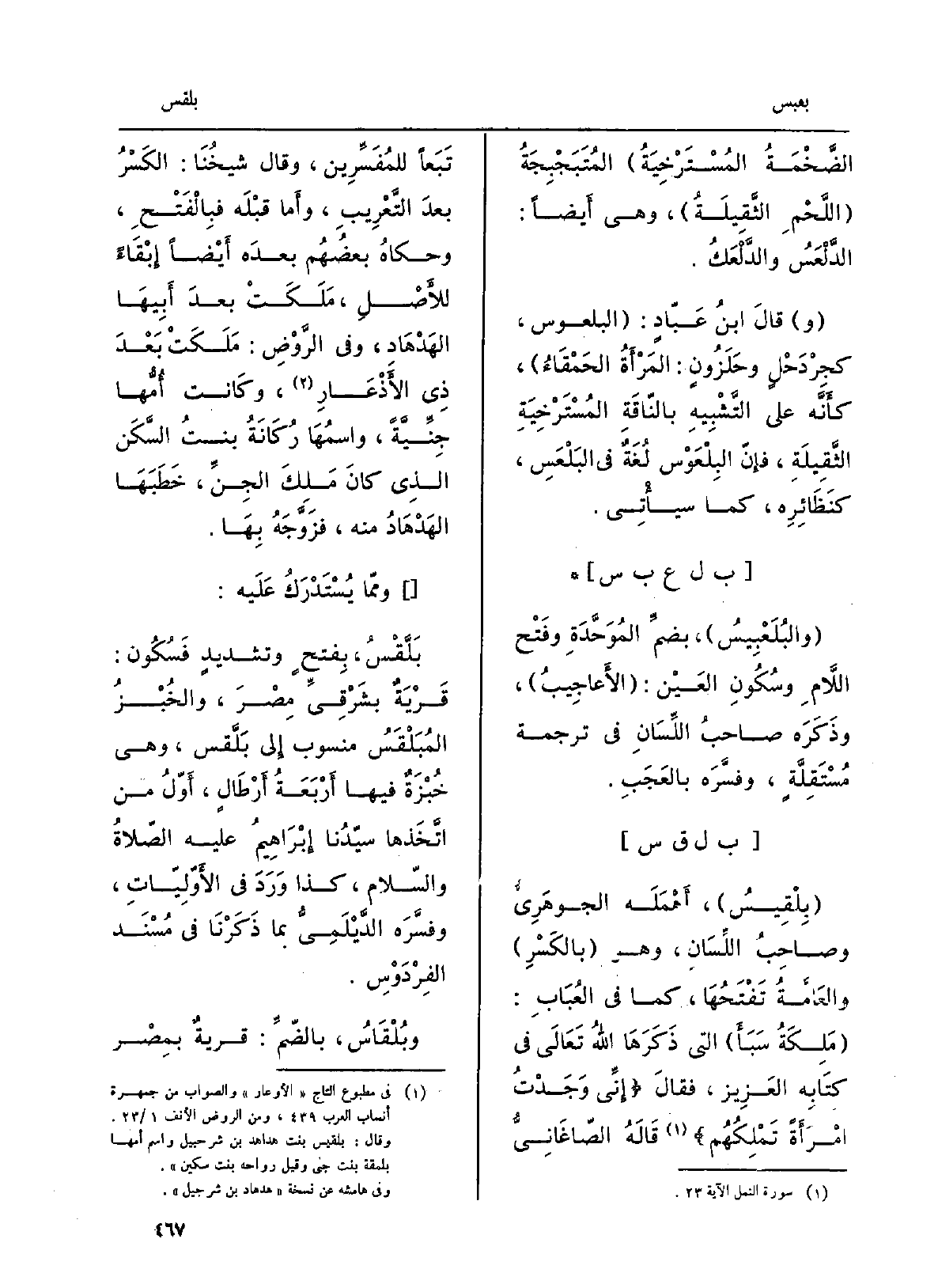 بِلْقيسُ، أهمله الجَوْهَرِيّ وصاحبُ اللِّسان، وَهُوَ بالكَسر والعامَّةُ تَفْتَحها، كَمَا فِي العُباب: مَلِكَةُ سَبَأَ الَّتِي ذَكَرَها اللهُ تَعَالَى فِي كِتَابه الْعَزِيز، فَقَالَ: إنِّي وَجَدْتُ امْرَأَة تَمْلِكُهم قَالَه الصَّاغانِيّ تَبَعَاً للمُفسِّرين، وَقَالَ شَيْخُنا: الكسرُ بعد التعريب، وَأما قَبْلَه فبالفتح، وَحَكَاهُ بعضُهم بعدَه أَيْضا إبْقَاء للْأَصْل، مَلَكَتْ بعدَ أَبِيهَا الهَدْهاد، وَفِي الرَّوْض: مَلَكَتْ بعد ذِي الأَذْعار، وَكَانَت أمُّها جِنِّيَّةً، واسمُها رُكَانَةُ بنتُ السَّكَن الَّذِي كَانَ مَلِكَ الجِنِّ، خَطَبَها الهَدْهاد مِنْهُ، فزَوَّجَه بهَا. ومِمّا يُسْتَدْرَك عَلَيْهِ: بَلَّقْس، بفتحٍ وتشديدٍ فسكونٍ: قريةٌ بشَرقيِّ مِصرَ، والخُبْزُ المُبَلْقَسُ منسوبٌ إِلَى بَلَّقس، وَهِي خُبزَةٌ فِيهَا أربعةُ أَرْطَالٍ، أوّلُ من اتَّخذَها سيِّدُنا إبراهيمُ عَلَيْهِ الصلاةُ وَالسَّلَام، كَذَا وَرَدَ فِي الأوَّلِيَّات، وفَسَّره الدَّيْلَمِيُّ بِمَا ذَكَرْنا فِي مُسنَد الفِرْدَوْس. وبُلْقاس، بالضَّمّ: قريةٌ بمِصر