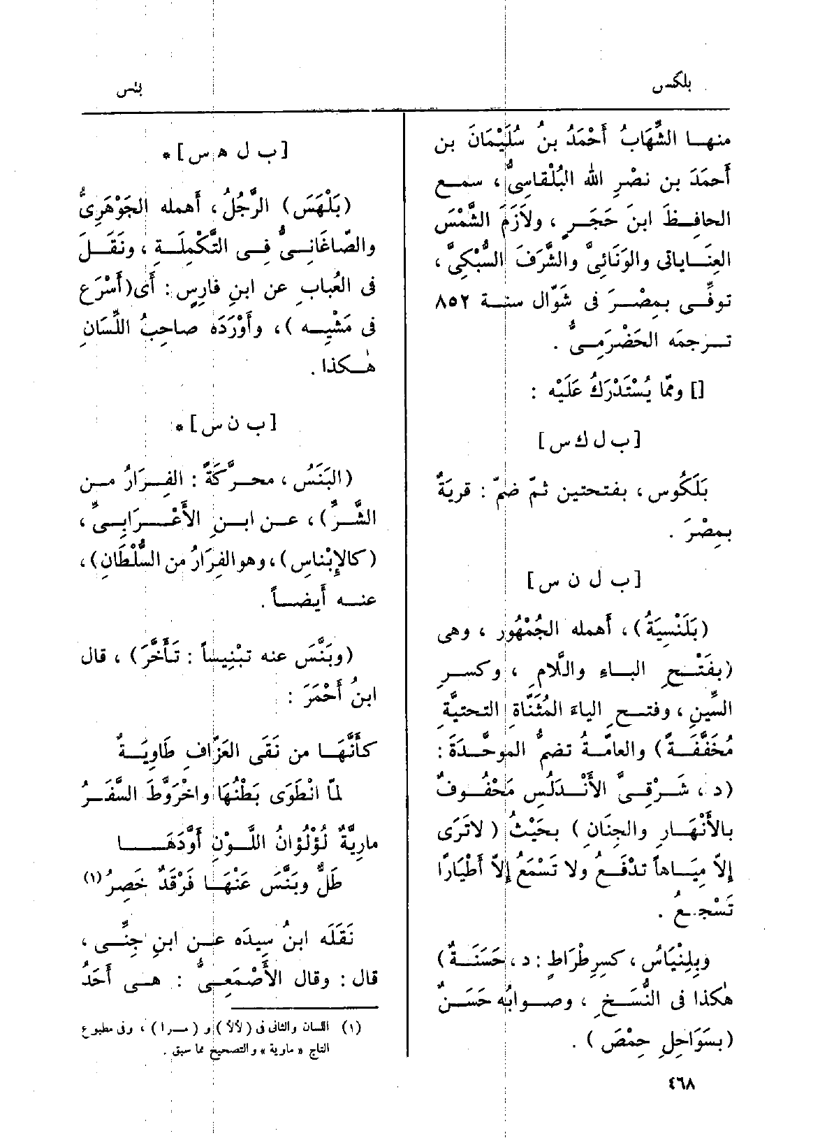 بَلَنْسِيَةُ، أهمله الجُمهور، وَهِي بفتحِ الباءِ واللامِ، وكسرِ السينِ، وَفتح الياءِ المُثَنّاةِ التحتيّةِ مُخفَّفةً والعامةُ تضمُّ الموحَّدةَ: د، شَرْقِيَّ الأندلس مَحْفُوفٌ بالأنهارِ والجِنان بحيثُ لَا ترى إلاّ مِياهاً تدفعُ وَلَا تَتْسَمعُ إلاّ أَطْيَاراً تَسْجَعُ. وبِلِنْياسُ، كسِرِطْراط: د، حَسَنَةٌ هَكَذَا فِي النُّسَخ، وصوابُه حسنٌ بسَواحِلِ حِمْص.