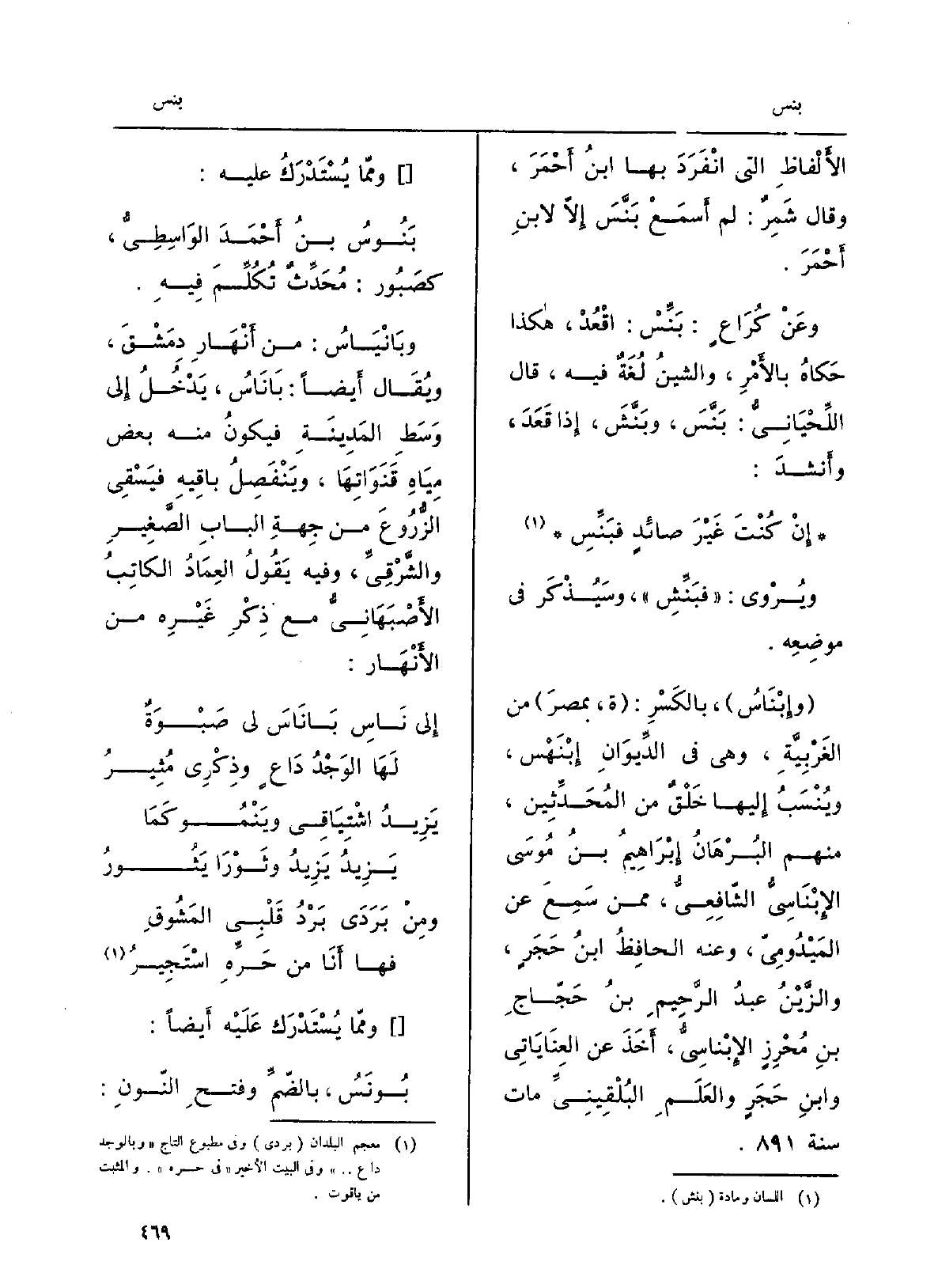 الألفاظِ الَّتِي انفردَ بهَا ابنُ أحمرَ، وَقَالَ شَمِرٌ: لم أسمعْ بَنَّسَ إلاّ لابنِ أَحْمَرَ. وَعَن كُراع: بَنِّسْ، اقْعُدْ، هَكَذَا حَكَاهُ بالأمرِ، والشينُ لغةٌ فِيهِ، قَالَ اللِّحْيانيُّ: بَنَّسَ، وبَنَّشَ، إِذا قَعَدَ، وَأنْشد: إنْ كنتَ غَيْرَ صائدٍ فبَنِّسْ ويُروى: فبَنِّشْ، وسيُذكَرُ فِي مَوْضِعه. وإبْناسُ، بالكَسْر: ة، بمِصر من الغربيّة، وَهِي فِي الدِّيوانِ ابْنَهْس، ويُنسَبُ إِلَيْهَا خلقٌ من المُحدِّثين، مِنْهُم البُرهانُ إبراهيمُ بنُ مُوسَى الإبْناسيُّ الشافعيُّ، مِمَّن سَمِعَ عَن المَيْدوميِّ، وَعنهُ الحافظُ ابنُ حَجَرٍ، والزَّيْنُ عبدُ الرحيمِ بنُ حَجّاجِ بنِ مُحرِزٍ الإبْناسيُّ، أَخَذَ عَن العِناياتي وابنِ حَجَرٍ والعلَمِ البُلْقينيِّ مَاتَ سنة. ومِمّا يُسْتَدْرَك عَلَيْهِ: بَنُوسُ بنُ أَحْمد الواسِطيُّ، كصَبُور: مُحدِّثٌ تُكُلِّمَ فِيهِ. وبانْياس: من أنهارِ دمشق، وَيُقَال أَيْضا: باناس، يَدْخُلُ إِلَى وَسَطِ المدينةِ فيكونُ مِنْهُ بعضُ مياهِ قَنَوَاتِها، ويَنْفَصِلُ باقِيه فيَسقي)