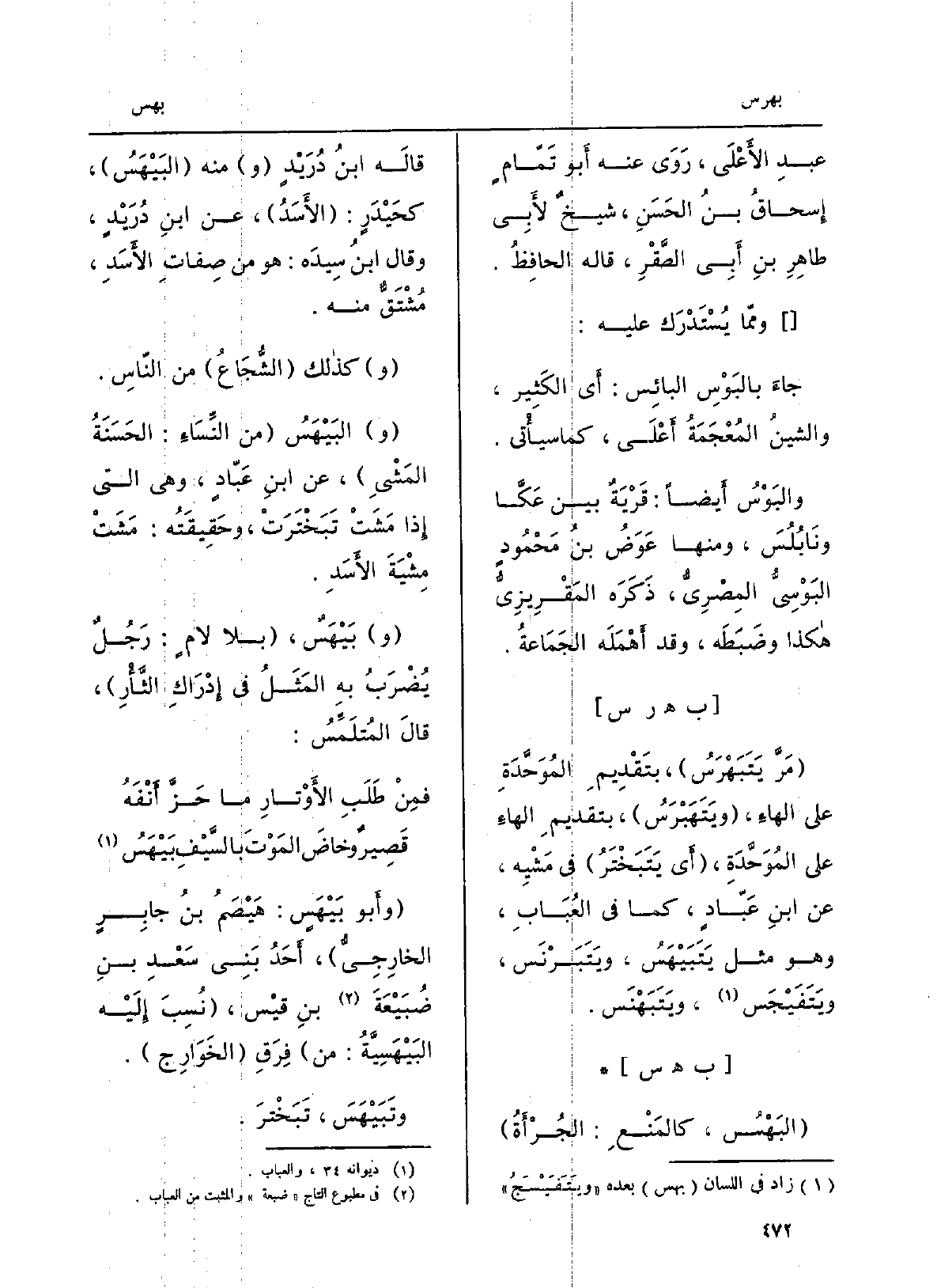 البَهْسُ، كالمَنْعِ: الجُرْأَةُ، قَالَه ابْن دُريد، مِنْهُ البَيْهَسُ، كحَيْدَرٍ: الأَسَدُ، عَن ابْن دُريد، وَقَالَ ابنُ سِيده: هُوَ من صِفَات الأَسَدِ، مُشتَقٌّ مِنْهُ. كَذَلِك الشُّجاع من النَّاس. البَيْهَسُ، من النِّساءِ: الحَسَنَةُ المَشْيِ، عَن ابْن عبَّادٍ، وَهِي الَّتِي إِذا مَشَتْ تبخْتَرَت، وحقيقتُه: مَشَتْ مِشْيَةَ الأَسد. بَيْهَسٌ، بِلَا لامٍ: رَجُلٌ يُضرَبُ بِهِ المَثلُ فِي إِدْرَاك الثَّأْرِ، قَالَ المُتَلَمِّسُ: