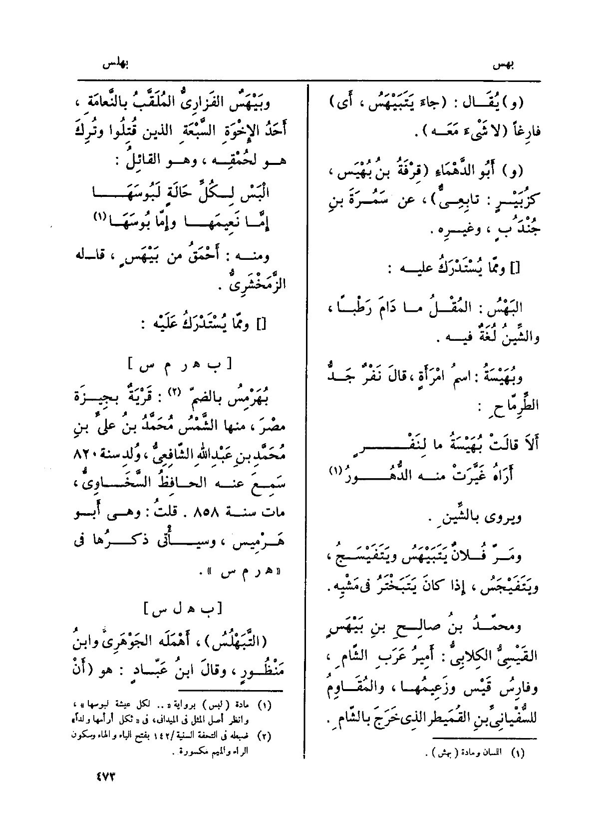 يُقال: جَاءَ يتبَيْهَسُ، أَي فارِغاً لَا شيءَ مَعَه. أَبو الدَّهماءِ قِرْفَةُ بنُ بُهَيْس، كزُبَيْرٍ: تابِعِيٌّ، عَن سَمُرَةَ بن جُنْدبٍ، وَغَيره. وَمِمَّا يُستدرك عَلَيْهِ: البَهْسُ: المُقْلَ مادامَ رَطباً، والشِّينُ لُغَةٌ فِيهِ. وبُهَيْسَةُ: اسمُ امْرأَةٍ، قَالَ نَفْرٌ جَدُّ الطِّرِمّاحِ:
