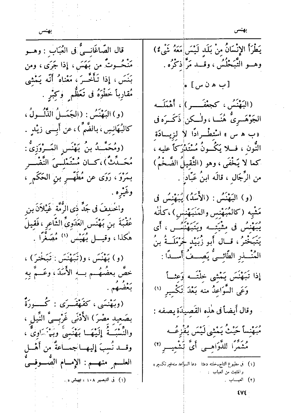 ومحمَّد بنُ بَهْنَسٍ المَرْوَزِيُّ: مُحَدِّثٌ، كَانَ مُسْتَمْلِيَ النَّضْرِ بِمَرْوَ، روى عَن مُطهّرِ بنِ الحَكَمِ، وغيرِه. واختُلِفَ فِي جَدِّ ذِي الرُّمَّةِ غَيلانَ بنِ عُقْبَةَ بنِ بَهْنَسٍ العدَوِيِّ الشَّاعِرِ، فَقيل هَكَذَا، وَقيل بُهَيْس مُصَغَّراً. بَهْنَسَ، وتَبَهْنَسَ: تبختَرَ، خصَّ بعضُهم بِهِ الأَسدَ، وعَمَّ بِهِ بعضُهم. وبَهْنَسَى، كقَهْقَرَى: كُورَةٌ بصَعيد مِصرَ الأَدنى غربيّ النيلِ، والنِّسْبَةُ إِلَيْهَا بَهْنَسِيٌّ وبَهْنساوِيٌّ، وَقد نُسِبَ إِلَيْهَا جماعةٌ من أَهل العلمِ مِنْهُم الإِمَام الصُّوفِي