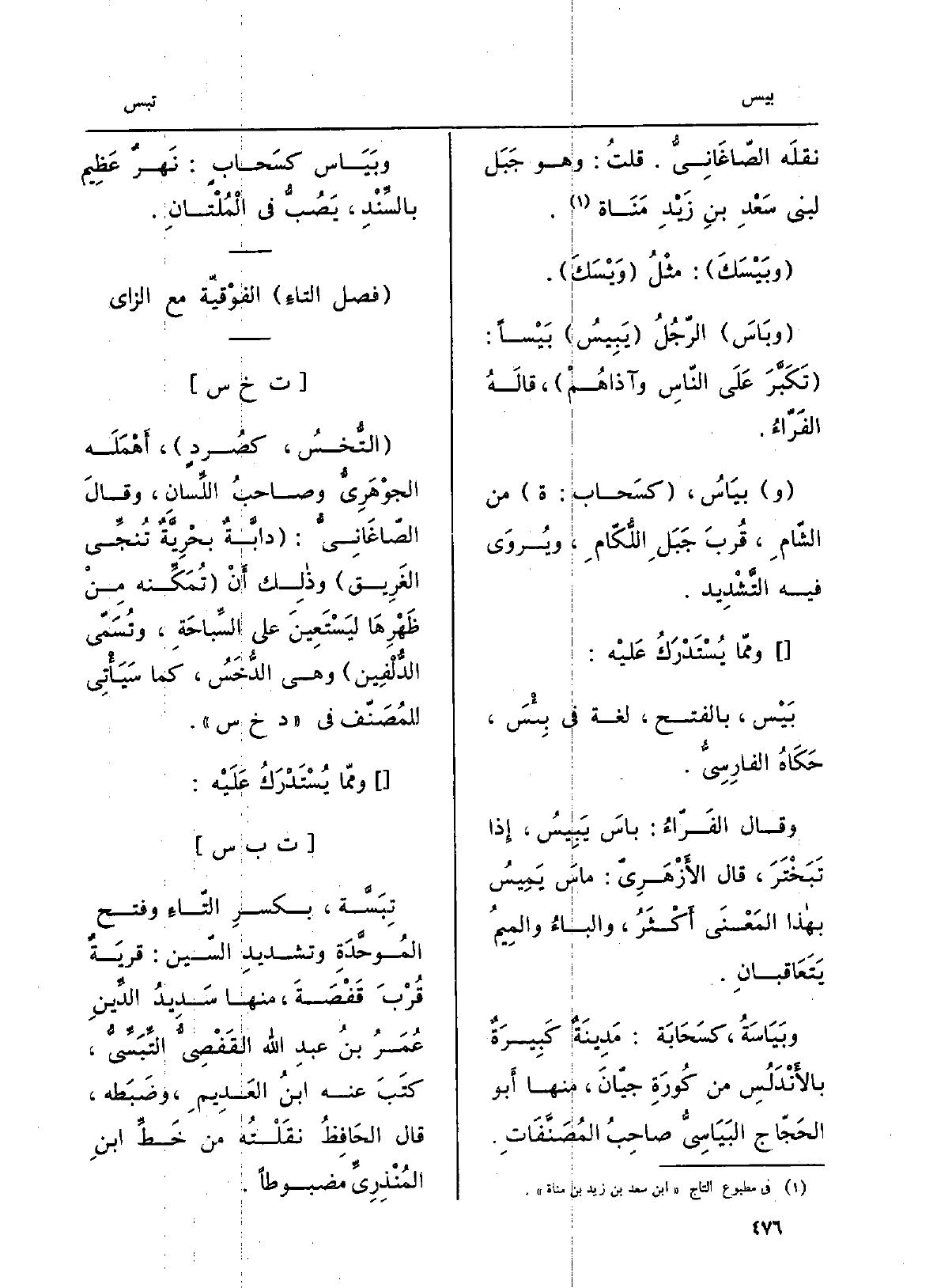 {وبَيْسَكَ: مثلُ وَيْسَكَ.} وبَاسَ الرَّجُلُ {يَبِيسُ} بَيْساً: تكَبَّرَ على النّاس وآذاهُمْ، قَالَه الفَرَّاءُ. {بَيَاسُ، كسَحاب: ة، من الشّامِ، قربَ جبل اللُّكامِ، ويُروَى فِيهِ التَّشْديد. وَمِمَّا يُستدرَك عَلَيْهِ:} بَيْس، بِالْفَتْح، لغةٌ فِي بِئْسَ، حَكَاهُ الفارسِيُّ. وَقَالَ الفرَّاءُ: {باسَ} يَبِيسُ، إِذا تبَخْتَرَ، قَالَ الأَزْهَرِيّ: ماسَ يَميسُ بِهَذَا الْمَعْنى أَكثرُ، والباءُ والميمُ يتعاقَبانِ. {وبَياسَةُ، كسَحابَة: مدينةٌ كبيرةٌ بالأَندلُسِ من كُورَة جَيَّانَ، مِنْهَا أَبو الحجَّاج} - البَياسيُّ صاحبُ المُصَنَّفاتِ.! وبَياس كسَحابٍ: نَهْرٌ عَظيمٌ بالسِّنْدِ، يَصُبُّ فِي المُلْتانِ.