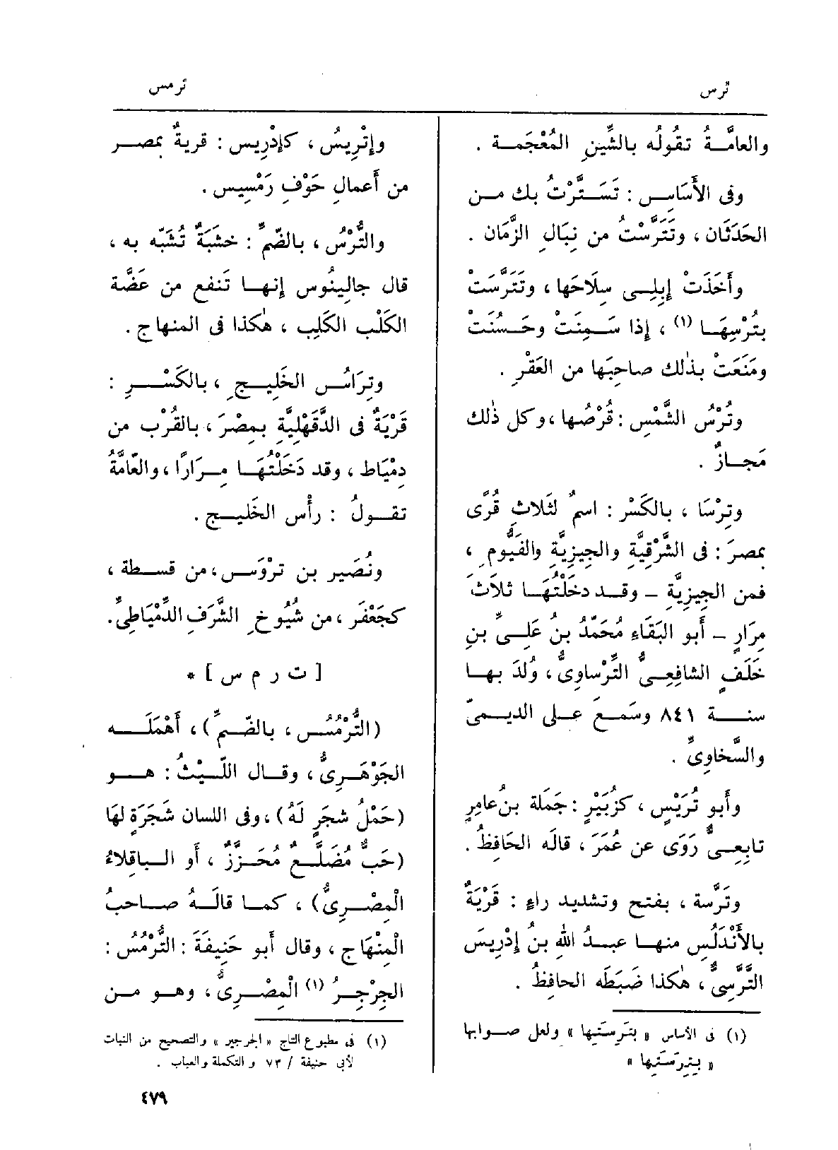 المُعْجَمَة. وَفِي الأَساس: تسَتَّرْتُ بك من الحَدثَان، وتَتَرَّسْت من نِبال الزَّمان. وأَخذَتْ إبِلِي سِلاحَها، وتَتَرَّسَتْ بتُرْسِها، إِذا سَمِنَتْ وحَسُنَتْ ومَنَعَتْ بذلكَ صاحبَها من العَقْرِ. وتُرْسُ الشَّمسِ: قُرْصُها، وكلُّ ذَلِك مَجازٌ. وتِرْسا، بالكَسرِ: اسمٌ لِثلاث قُرى بمِصْرَ: فِي الشَّرقيّة والجِيزِيَّة والفَيُّومِ، فمِن الجِيزِيَّة وَقد دَخَلْتُها ثلاثَ مِرارٍ: أَبو الْبَقَاء مُحَمَّد بن عليِّ بنِ خلَفٍ الشَّافِعِيُّ التِرْساوِيُّ، وُلد بهَا سنة وسَمِعَ على الدِّيميّ والسَّخاوِيِّ. وأَبو تُرَيْسٍ، كزُبَيْرٍ: جَمَلَةُ بنُ عامِرٍ تابِعِيٌّ روَى عَن عُمَرَ، قَالَه الحافظُ. وتَرَّسَه، بِفَتْح وَتَشْديد راءٍ: قَريَةٌ بالأَندَلُسِ مِنْهَا عَبْد الله بنُ إدريسَ التَّرَّسِيُّ، هَكَذَا ضبطَه الْحَافِظ. وإتْرِيسُ، كإدْريس: قريةٌ بمصرَ من أَعمال حَوْفِ رَمسيس. والتُّرْسُ، بالضَّمِّ: خشَبَةٌ تَشَبَّه بِهِ، قَالَ جالينوس إنَّها تَنفَعُ من عَضَّةِ الكَلْبِ الكَلِبِ، هَكَذَا فِي المِنهاج. وتِراسُ الخليجِ، بالكَسْرِ: قريةٌ فِي الدَّقَهْلِيَّةِ بمِصْرَ، بِالْقربِ من دِمياط، وَقد دخلْتُها مِراراً، والعامَّةُ تقولُ: رأْسُ الخليج. ونُصَيْر بن تَرْوَس، من قسطة، كجَعْفَر، من شيوخِ الشَّرفِ الدِّمْياطِيِّ.
