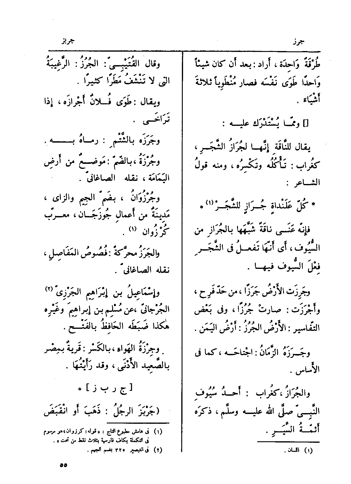 طُرقَةً وَاحِدَة، أَرَادَ: بعد أَن كَانَ شَيْئا وَاحِدًا طَوَىَ نَفْسَه فَصَارَ مُنْطَوِياً ثلاثةَ أَشْيَاء. ومِمّا يُسْتَدْرَك عَلَيْهِ: يُقَال للناقةِ إنّها لجُراز الشجرِ، كغُراب: تَأْكُله وتكْسِرُه، وَمِنْه قولُ الشَّاعِر: كلّ عَلَنْداةٍ جُرازٍ للشَّجَرْ فإنّه عَنى نَاقَة شَبَّهها بالجُراز من السُّيوف، أَي أنّها تَفْعَلُ فِي الشجرِ فِعلَ السيوف فِيهَا.