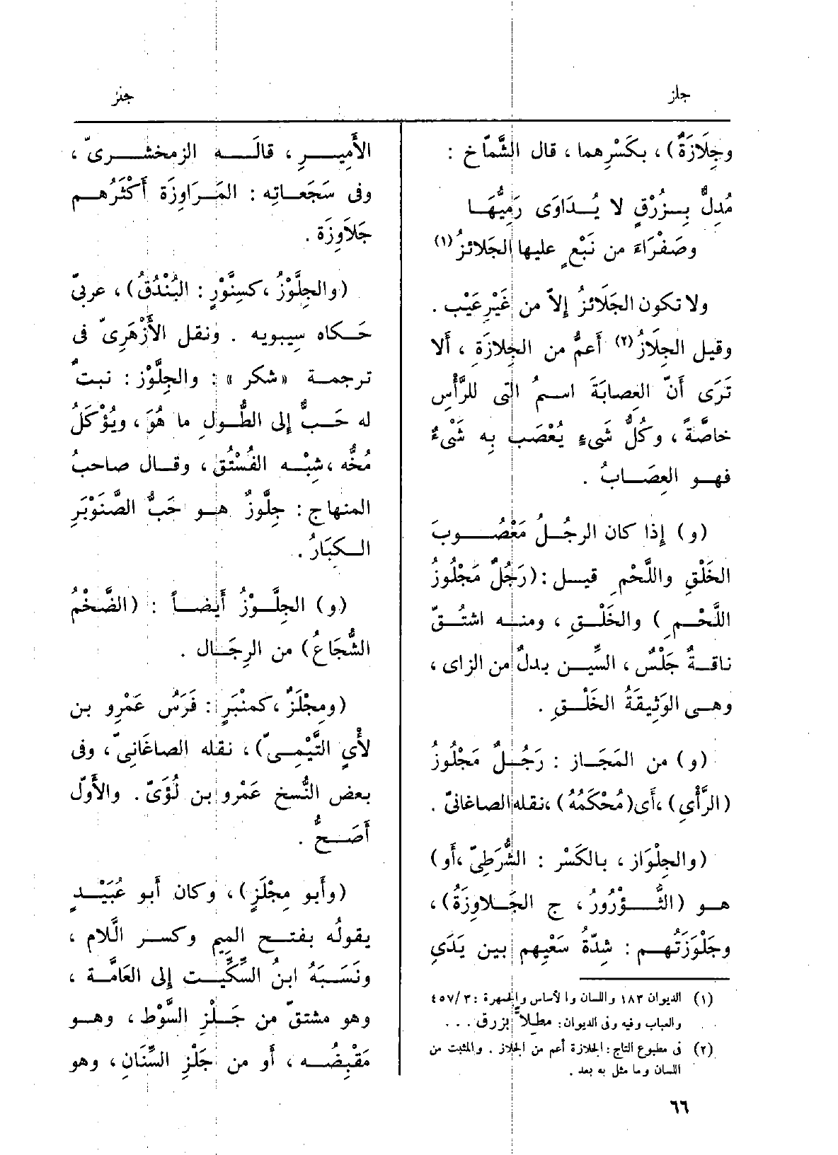 وَلَا تكون الجَلائزُ إلاّ من غَيْرِ عَيْب. وَقيل الجِلاز أعمُّ من الجِلازة، أَلا ترى أنّ العِصابةَ اسمُ الَّتِي للرأسِ خاصّةً، وكلُّ شيءٍ يُعصَبُ بِهِ شيءٌ فَهُوَ العِصَاب. إِذا كَانَ الرجلُ مَعْصُوبَ الخَلْقِ واللحمِ قيل: رجلٌ مَجْلُوزُ اللحمِ والخَلْق، وَمِنْه اشتُقّ ناقةٌ جَلْسٌ، السِّين بدلٌ من الزَّاي، وَهِي الوَثيقةُ الخَلْق. منَ المَجاز: رجلٌ مَجْلُوزُ الرَّأْي، أَي مُحْكَمُه، نَقله الصَّاغانِيّ. والجِلْواز،)
