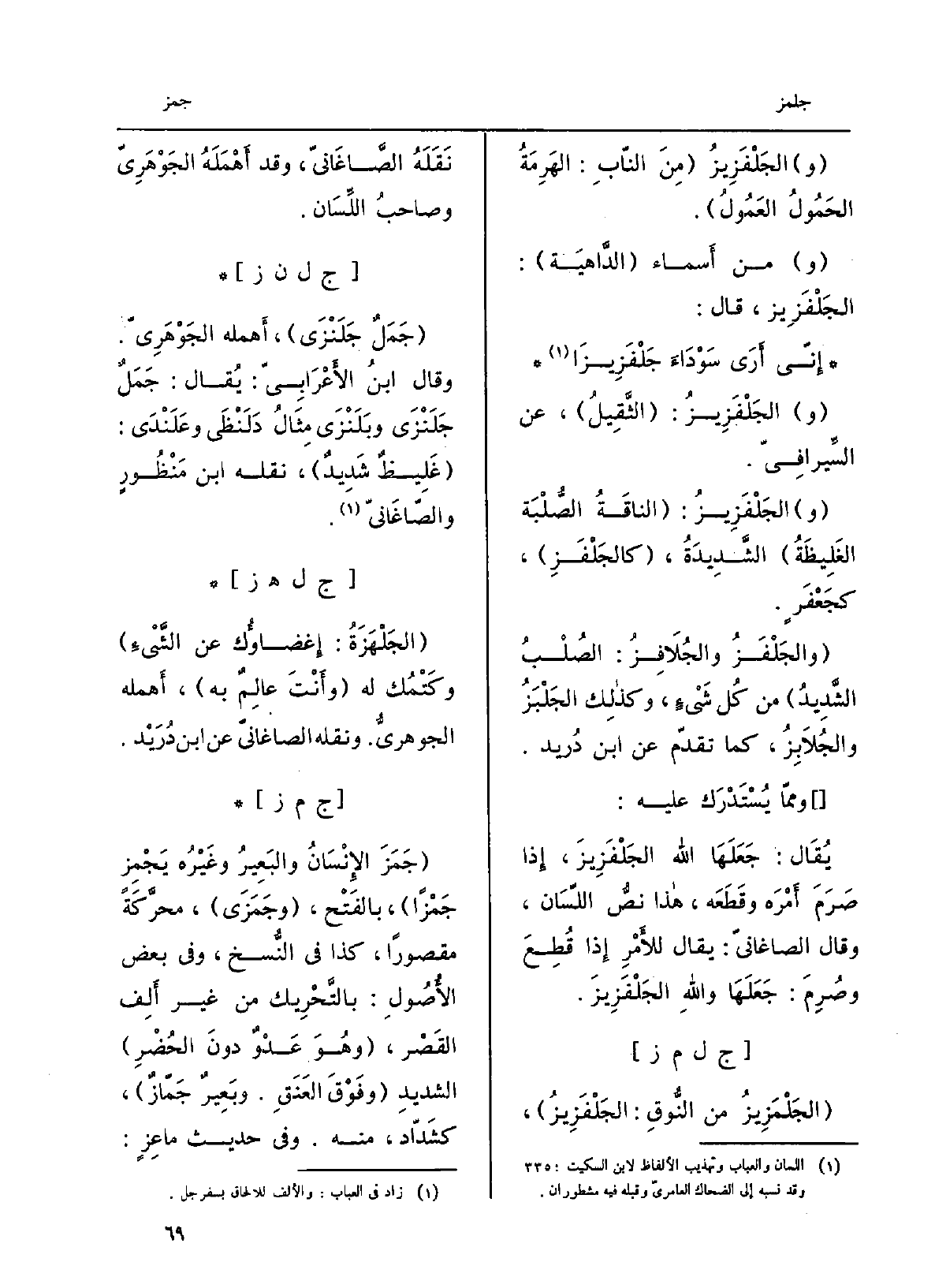 الجَلْفَزيزُ من النابِ: الهَرِمَةُ الحَمُولُ العَمُول. من أسماءِ الدّاهية: الجَلْفَزيز، قَالَ: إنّي أرى سَوْدَاءَ جَلْفَزِيزا الجَلْفَزيز: الثّقيلُ، عَن السِّيرافيّ. الجَلْفَزيز: الناقةُ الصُّلبةُ الغليظةُ الشديدةُ، كالجَلْفَز، كَجَعْفَر.