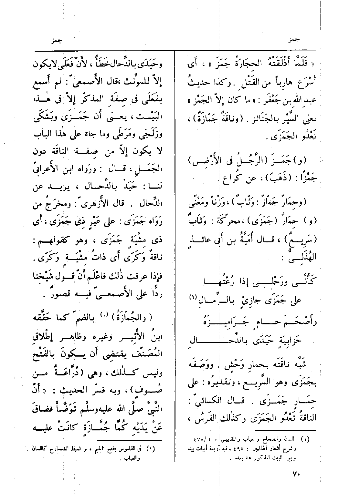 فلمّا أَذْلَقَتْه الحِجارةُ جَمَزَ، أَي أسرعَ هارِباً من الْقَتْل. وَكَذَا حَدِيث عَبْد الله بن جَعْفَر: مَا كَانَ إلاّ الجَمْز. يَعْنِي السَّيْر بالجَنائز. وناقةٌ جَمّازةٌ، تَعْدُو الجَمَزى. جَمَزَ الرجلُ فِي الأرضِ جَمْزَاً: ذَهَبَ، عَن كُراع. وحِمارٌ جَمّازٌ: وَثّاب، وَزْنَاً ومَعْنَىً. حمارٌ جَمَزَى، محرّكةً: وَثّابٌ سريعٌ، قَالَ أُميّةُ بن أبي عائذٍ الهُذَليّ: