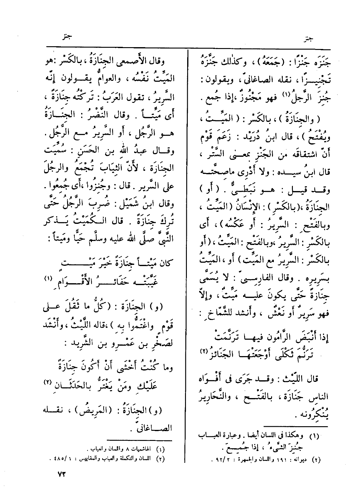 قَالَ اللَّيْث: وَقد جرى فِي أَفْوَاه الناسِ جَنازة، بِالْفَتْح، والنَّحارير يُنكِرونَه. وَقَالَ الأَصْمَعِيّ الجِنازةُ، بِالْكَسْرِ: هُوَ الميِّتُ نَفْسُه، والعوامُّ يَقُولُونَ إنّه السرير، تَقول الْعَرَب: تَرَكْته جِنازةً، أَي ميِّتاً. وَقَالَ النَّضْر: الجِنازةُ هُوَ الرجل، أَو السريرُ مَعَ الرجُل. وَقَالَ عَبْد الله بن الْحسن: سُمِّيتْ الجِنازة، لأنّ الثِّيَاب تُجمَعُ والرجلَ على السرير. قَالَ: وجُنِزوا، أَي جُمِعوا. وَقَالَ ابْن شَمَيْل: ضُرِبَ الرجلُ حَتَّى تُرِكَ جِنازةً. قَالَ الكُمَيْتُ يذكر النبيَّ صلّى الله عَلَيْهِ وسلَّم حيَّاً ومَيتاً: