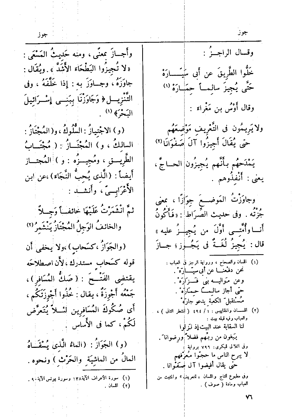 يَمْدَحُهم بأنّهم {يُجيزون الحاجَّ، يَعْنِي: أَنْفِذوهم.} وجاوَزْتُ المَوضعَ {جِوازاً، بِمَعْنى} جُزْتُه. وَفِي حَدِيث الصِّراط: فأَكونُ أَنا وأمَّتي أوّلَ من {يُجيزُ عَلَيْهِ قَالَ: يُجيزُ لغةٌ فِي} يُجوزُ {جازَ} وأَجازَ بِمَعْنى، وَمِنْه حَدِيث المَسْعى: لَا {تُجيزوا البَطْحاءَ الأشَدَّ. وَيُقَال:} جاوَزَه، {وجاوَزَ بِهِ: إِذا خَلَّفَه، وَفِي التَّنْزِيل:} وجاوَزْنا ببَني إسرائيلَ البَحر. (و) {الاجْتِياز: السُّلوك، و (} المُجْتاز: السالِك، و) {المُجْتاز: مُجتابُ الطريقِ،} ومُجيزُه، و) {المُجْتاز أَيْضا: الَّذِي يُحِبُّ النَّجاءَ، عَن ابْن الأَعْرابِيّ، وَأنْشد: