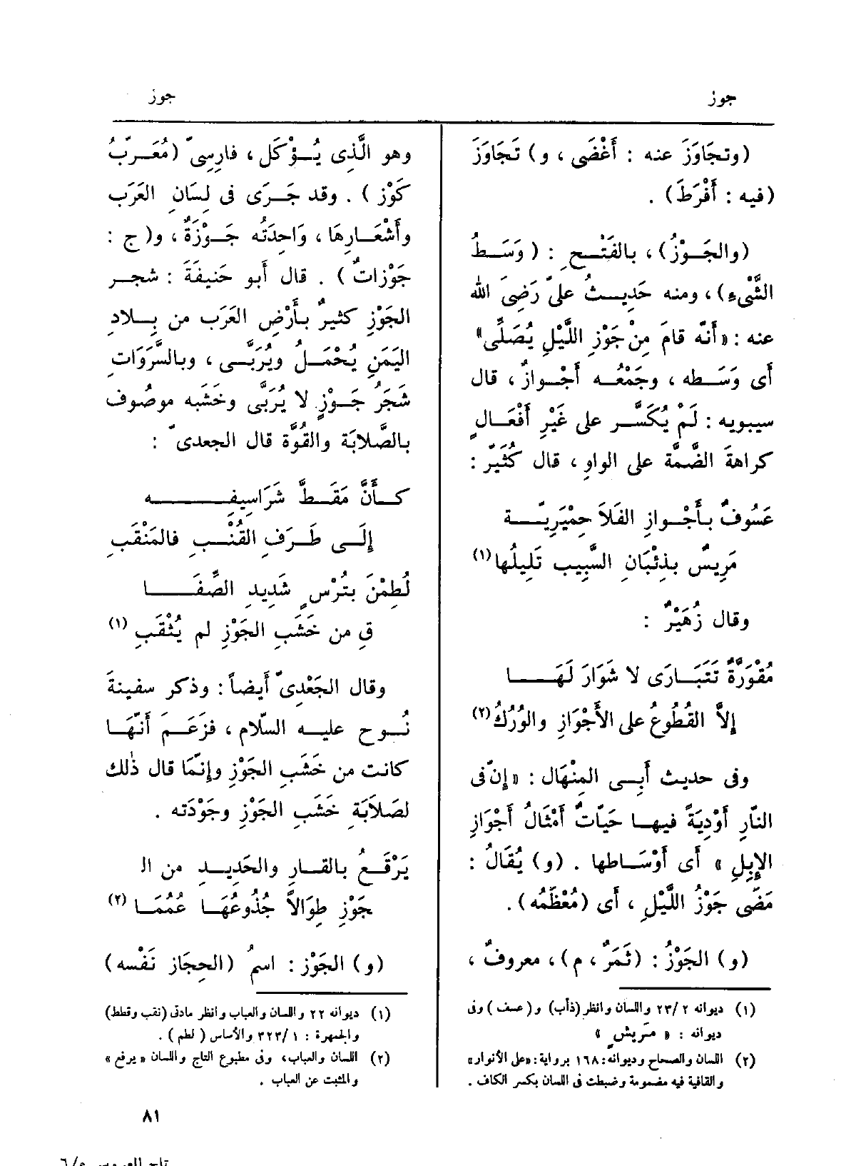 وَفِي حَدِيث أبي المِنْهال: إنّ فِي النَّار أَوْدِيةً فِيهَا حَيّاتٌ أَمْثَالُ أَجْوَازِ الْإِبِل. أَي أَوْسَاطِها. يُقَال: مَضَىَ جَوْزُ اللَّيْل، أَي مُعظَمُه. الجَوْز: ثَمَرٌ، م، معروفٌ، وَهُوَ الَّذِي يُؤكَل، فارسيٌّ مُعرَّب كَوْز. وَقد جرى فِي لسانِ الْعَرَب وأَشْعَارِها، واحدِتُه {جَوْزَةٌ وَج:} جَوْزَاتٌ. قَالَ أَبُو حنيفَة: شجر {الجَوْزِ كثيرٌ بأرضِ الْعَرَب من بِلَاد اليمنِ يُحمَلُ ويُرَبَّى، وبالسَّرَواتِ شجرُ} جَوْزٍ لَا يُربَّى وَخَشَبُه مَوْصُوف بالصّلابةِ والقُوّة قَالَ الجعديّ: