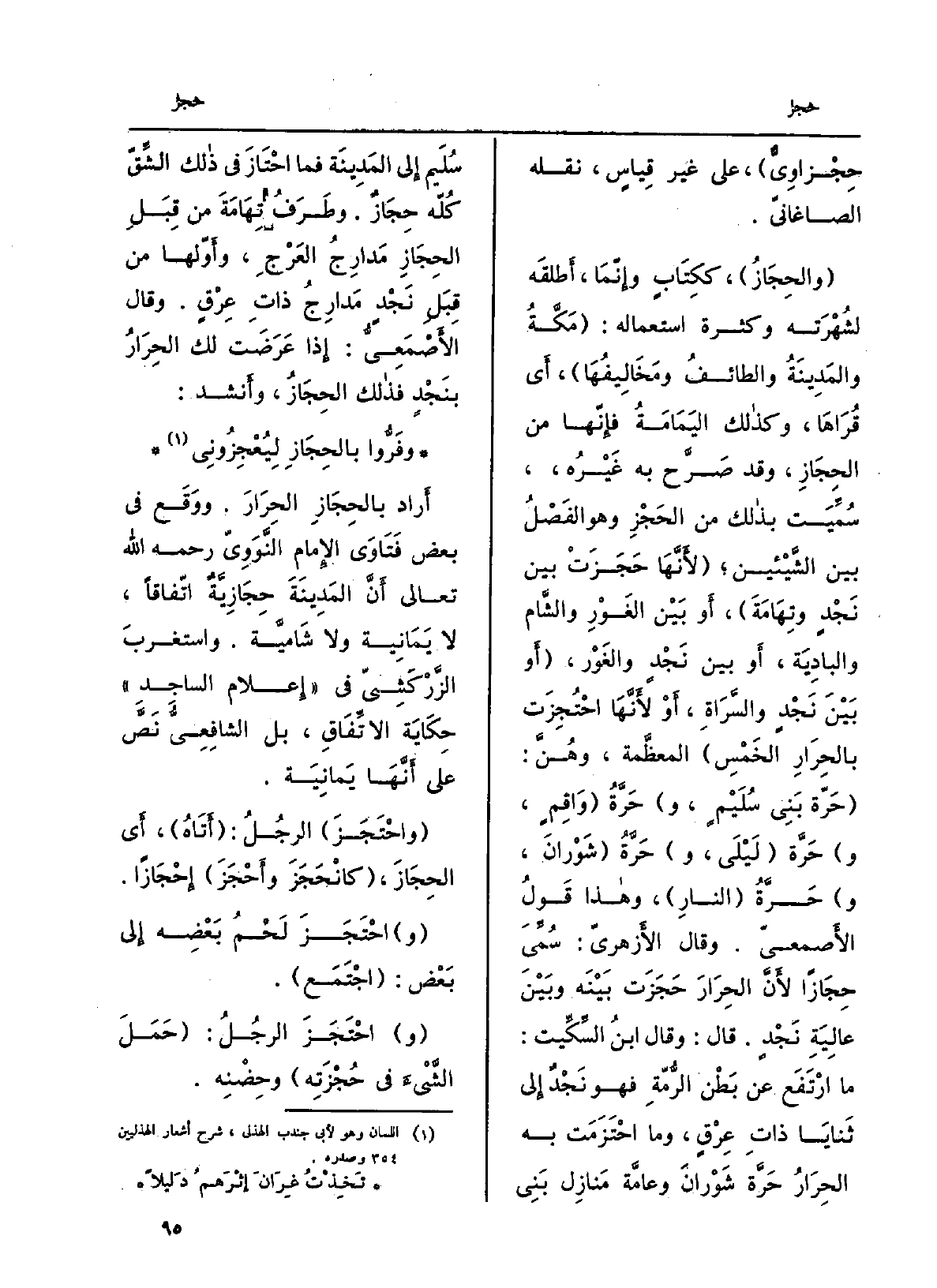 حِجْزاويٌّ، على غيرِ قياسٍ، نَقله الصَّاغانِيّ. والحِجاز، ككِتابٍ وإنّما أطلقهُ لشُهرتِه وَكَثْرَة اسْتِعْمَاله: مكّةُ والمَدينةُ والطائفُ ومَخاليفُها، أَي قُراها، وَكَذَلِكَ اليَمامةُ فإنّها من الحِجاز، وَقد صرَّحَ بِهِ غَيْرُه، سُمِّيت بذلك من الحَجْزِ وَهُوَ الفَصلُ بَين الشَّيئَيْن لأنّها حَجَزَتْ بَين نَجْدٍ وتِهامة، أَو بَين الغَوْرِ وَالشَّام والبادية، أَو بَين نَجْدٍ والغَوْر، أَو بَين نَجْدٍ والسَّراة، أَو لأنّها احْتُجِزَت بالحِرارِ الخَمس المعظَّمة، وهنَّ: حَرّة بني سُلَيْمٍ، وحرَّةُ واقِمٍ، وحَرَّة لَيْلَى، وحَرَّة شَوْرَان، وحَرّة النَّار، وَهَذَا قولُ الأَصْمَعِيّ. وَقَالَ الأَزْهَرِيّ: سُمّي حِجازاً لأنّ الحِرار حَجَزَتْ بَيْنَه وبينَ عالِيَةِ نَجْدٍ. قَالَ: وَقَالَ ابْن السِّكِّيت: مَا ارتفعَ عَن بَطْنِ الرُّمّةِ فَهُوَ نَجْدٌ إِلَى ثَنايا ذاتِ عِرْقٍ، وَمَا احْتَزَمَت بِهِ الحِرارُ حَرَّة شَوْرَان وعامّة مَنازلِ بني سُلَيْم إِلَى الْمَدِينَة فَمَا احْتازَ فِي ذَلِك الشِّقّ كلّه حِجازٌ. وطرَفُ تِهامةَ من قِبَلِ الحِجازِ مَدارجُ العَرْج، وأوّلها من قِبَلِ نجدٍ مدارجُ ذاتِ عِرْقٍ. وَقَالَ الأَصْمَعِيّ: إِذا عَرَضَت لَك الحِرارُ بنَجدٍ فَذَلِك الحِجاز، وَأنْشد: وفَرُّوا بالحِجازِ ليُعْجِزوني أَرَادَ بالحِجاز الحِرار. وَوَقَع فِي بعضِ فَتاوى الإِمَام النَّوَويّ رَحمَه اللهُ تَعَالَى أنّ المدينةَ) حِجازِيَّةٌ اتِّفاقاً، لَا يَمانية وَلَا شاميّة. واستغربَ الزَّرْكَشيّ فِي إِعْلَام الساجِد. حاكيةَ الاتِّفاق، بل الشافعيُّ نصَّ على أنّها يَمانِيَة. واحْتَجَزَ الرجلُ: أَتَاهُ، أَي الحِجاز، كانْحَجَزَ وأَحْجَزَ إحْجازاً.