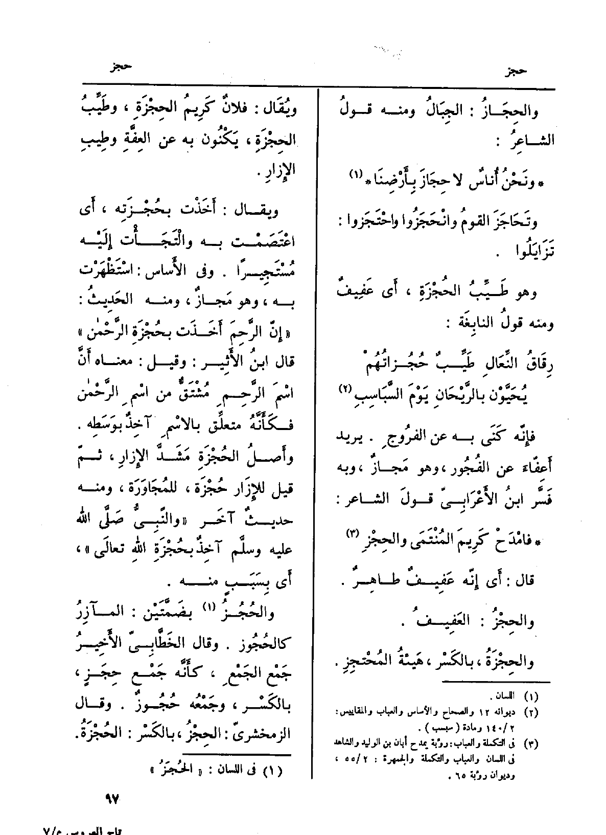 فإنّه كَنَى بِهِ عَن الْفروج. يُرِيد أَعِفَّاءَ من الفُجور، وَهُوَ مَجاز، وَبِه فَسّر ابْن الأَعْرابِيّ قولَ الشَّاعِر: فامْدَحْ كَريمَ المُنْتَمى والحِجْزِ قَالَ: أَي إنّه عَفيفٌ طاهرٌ. والحِجْزُ: العَفيف. والحِجْزَة، بِالْكَسْرِ: هَيْئَةُ المُحتَجِز. وَيُقَال: فلانٌ كريمُ الحِجْزَة، وطَيِّبُ الحِجْزَة، يَكْنُون بِهِ عَن العِفَّةِ وطِيبِ الْإِزَار. وَيُقَال: أَخَذْت بحُجْزَتِه، أَي اعتصَمْت بِهِ والْتَجَأْت إِلَيْهِ مُستَجيراً. وَفِي الأساس: اسْتَظْهَرْت بِهِ، وَهُوَ مَجاز، وَمِنْه الحَدِيث:) إنّ الرَّحِمَ أَخَذَت بحُجْزَةِ الرَّحمن قَالَ ابنُ الْأَثِير: وَقيل: مَعْنَاهُ أنّ اسمَ الرَّحِمِ مُشتَقٌّ من اسمِ الرَّحْمَن فكأنّه متعلِّقٌ بالاسمِ آخِذٌ بوسَطِه. وأصلُ الحُجْزَةِ مَشَدُّ الْإِزَار، ثمّ قيل للإزار حُجْزَة، للمُجاوَرَة، وَمِنْه حديثٌ آخر: وَالنَّبِيّ صلّى الله عَلَيْهِ وسلَّم آخِذٌ بحُجْزَةِ اللهُ تَعَالَى، أَي بسَببٍ مِنْهُ. والحُجُز بضمَّتَيْن: المآزِرُ كالحُجوز. وَقَالَ الخَطَّابيّ الأخيرُ جَمْعُ الجَمعِ، كأنّه جَمْعُ حِجَزٍ، بِالْكَسْرِ، وجَمْعُه حُجوزٌ. وَقَالَ الزَّمَخْشَرِيّ: الحِجْزُ، بِالْكَسْرِ: الحُجْزَة.