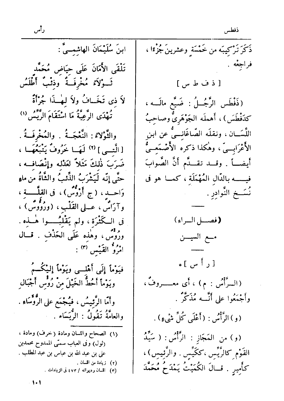 {الرَّأْسُ: م، أَي معروفٌ، وأَجْمَعُوا على أَنَّه مُذَكَّرٌ. والرَّأْسُ: أَعْلَى كُلِّ شيْءٍ. وَمن المَجَازِ: الرَّأْسُ: سَيِّدُ القَوْمِ} كالرَّيِّسِ، ككَيِّسٍ. {والرَّئِيسِ، كأَمِيرٍ. قالَ الكُمَيْتُ يَمْدَحُ مُحَمَّدَ ابنَ سُلَيْمَانَ الهاشِمِيَّ: