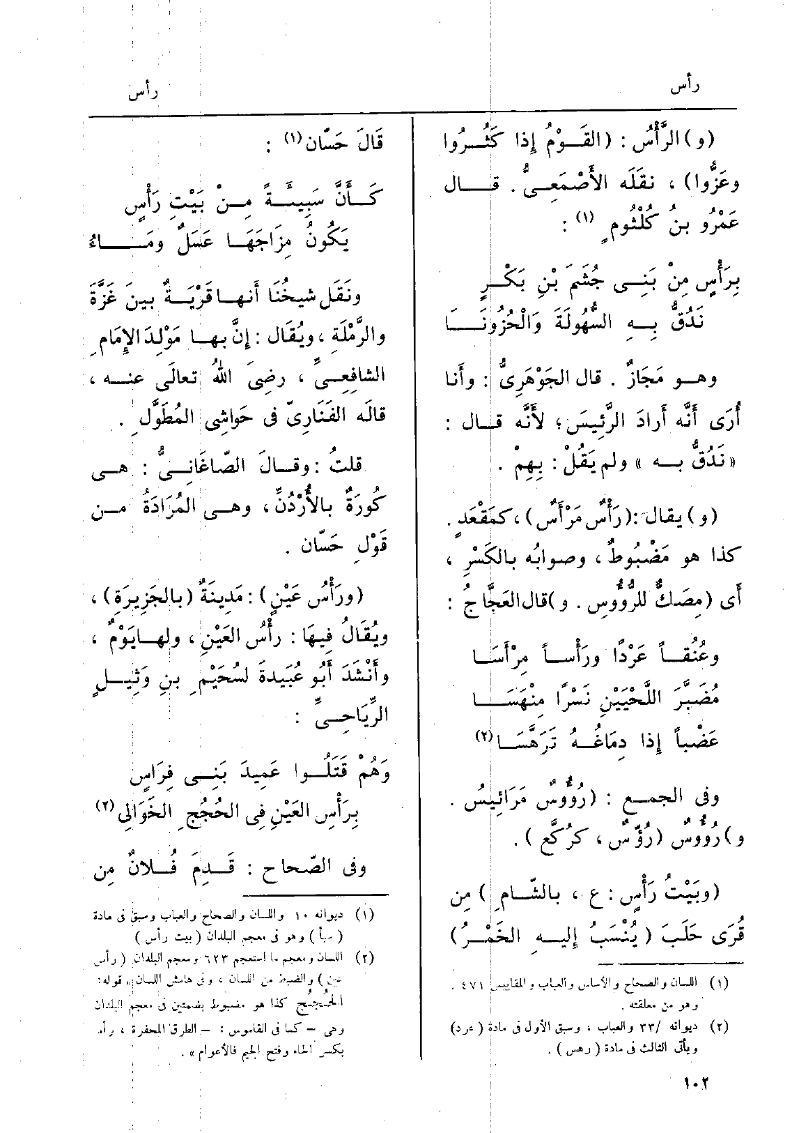 وَيُقَال: {رَأْسٌ} مَرْأَسٌ، كمَقْعَدٍ. كَذَا هُوَ مَضْبُوطٌ، وصوابُه بالكَسْرِ، أَي مِصَكٌّ {للرُّؤُوسِ. وَقَالَ العَجَّاجُ: وعُنُقَاً عَرْداً ورَأْساً} مِرْأَسَا مُضَبَّرَ اللَّحْيَيْنِ نَسْراً مِنْهَسَا عَضْباً إِذا دِمَاغُهُ تَرَهَّسَا وَفِي الْجمع: {رُؤُوسٌ} مَرَائِيسُ. و) {رُؤُوسٌ} رُؤّسٌ، كرُكَّع. وبَيْتُ {رَأْسٍ: ع، بالشّامِ مِن قُرَى حَلَبَ) يُنْسَبُ إِليهِ الخَمْرُ قالَ حَسّان: كَأَنَّ سَبِيئَةً مِنْ بَيْتِ رَأْسٍ يَكُونُ مِزَاجَهَا عَسَلٌ ومَاءُ ونَقَل شيخُنَا أَنها قَرْيَةٌ بينَ غَزَّةَ والرَّمْلَةِ، ويُقَال: إِنَّ بهَا مَوْلِدَ الإِمَامِ الشافِعِيِّ، رضِيَ اللهُ تعالَى عَنهُ، قالَه الفَنَارِيّ فِي حَواشِي المُطَوَّلِ. قلتُ: وقالَ الصّاغَانِيُّ: هِيَ كُورَةٌ بالأُرْدُنِّ، وَهِي المُرَادَةُ من قَوْلِ حَسّان.} ورَأْسُ عَيْنٍ: مَدِينةٌ بالجَزِيرَةِ، ويُقَالُ فِيهَا: {رأْسُ العَيْنِ، وَلها يَوْمٌ، وأَنْشَدَ أَبُو عُبَيدَةَ لسُحَيْمِ بنِ وَثِيلٍ الرِّياحِيِّ:
