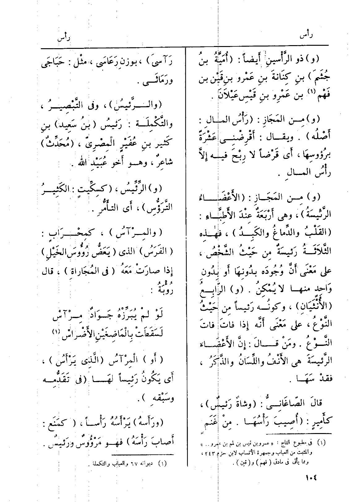 وَذُو الرَّأْسينِ أَيضاً: أُمَيَّةُ بنُ جُشَمَ بنِ كِنَانةَ بنِ عَمْرو بنِ قَيْن بن فَهْم بن عَمْرِو بنِ قَيْسِ عَيْلاَنَ. ومِن المَجَازِ: رَأْسُ المالِ: أَصْلُه. وَيُقَال: أَقْرِضْنِي عَشْرَةً برُؤوسِهَا، أَي قَرْضاً لَا رِبْحَ فِيهِ إلاَّ رأْسُ المالِ.