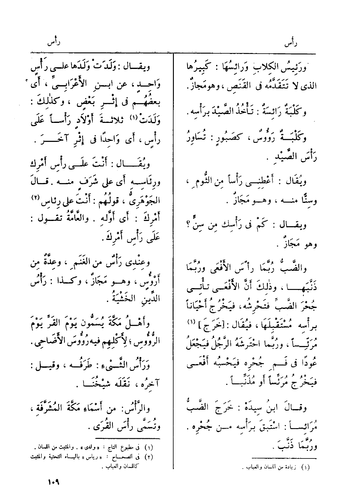 {ورَئِيسُ الكِلابِ} ورائِسُهَا: كَبِيرُها الَّذِي لَا تَتَقَدَّمُه فِي القَنَصِ، وَهُوَ مَجازٌ. وكَلبة {رائسة: يَأْخُذ الصَّيْد. وكَلْبَةٌ} رَؤُوسٌ، كصَبُورٍ: تُسَاوِرُ رَأْسَ الصَّيْدِ. ويُقَال: أَعْطِنِي {رَأْساً مِن الثُّومِ، وسِنًّا مِنْهُ، وَهُوَ مَجَازٌ. وَيُقَال: كَمْ فِي} رَأْسِك مِن سِنٍّ وَهُوَ مَجَازٌ. والضَّبُّ رُبَّمَا {رأَّسَ الأَفْعَى ورُبَّمَا ذَنَّبَها، وذلِكَ أَنَّ الأَفْعَى تَأْتِي جُحْرَ الضَّبِّ فتَحْرِشُه، فيَخْرُجُ أَحْيَاناً برأْسِه مُسْتَقْبِلَهَا، فيُقَال: خَرَجَ} مُرَئِّساً، ورُبَّما احْتَرشَهُ الرَّجُلُ فيَجْعَلُ عُوداً فِي فَمِ جُحْرِه فيَحْسبُه أَفْعَى فيَخْرُجُ {مُرَئِّساً أَو مُذَنِّباً.