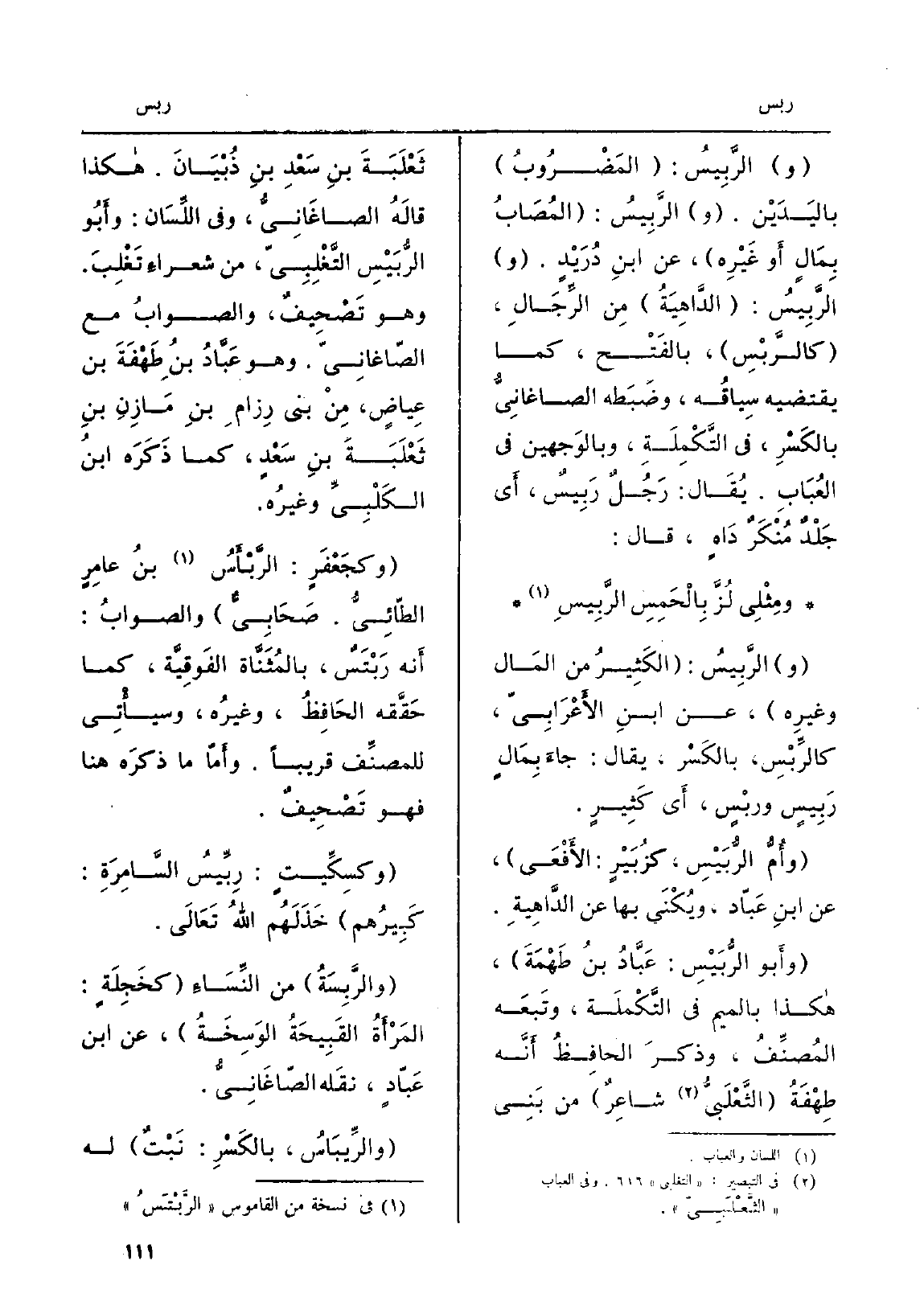وأَبو الرُّبَيْسِ: عَبَّادُ بنُ طَهْمَةَ، هَكَذَا بِالْمِيم فِي التَّكْملَة، وتَبعَه المُصنِّفُ، وذكرَ الحافِظُ أَنَّه طِهْفَةُ الثَّعْلَبيُّ شاعِرٌ من بَنِي ثَعْلَبَةَ بنِ سَعْدِ بنِ ذُبْيَانَ. هَكَذَا قالَهُ الصاغَانِيُّ، وَفِي اللِّسَان: وأَبُو الرُّبَيْسِ التَّغْلِبِيّ، من شعراءِ تَغْلِبَ. وَهُوَ تَصْحِيفٌ، والصوابُ مَعَ الصّاغانِيّ. وَهُوَ عَبَّادُ بنُ طَهْفَةَ بن عِياضٍ، مِنْ بني رِزام بنِ مَازِنِ بنِ ثَعْلَبَةَ بنِ سَعْدٍ، كَمَا ذَكَرَه ابنُ الكَلْبِيِّ وغيرُه. وكجَعْفَرٍ: الرَّبْأَسُ بنُ عامِرٍ الطّائِيُّ. صَحَابِيٌّ والصوابُ: أَنه رَبْتَسٌ، المُثنَّاة الفَوقِيَّة، كَمَا حَقَّقه الحَافِظُ، وغيرُه، وسيأْتِي للمصنِّف قَرِيبا. وأَمّا مَا ذكرَه هُنَا فَهُوَ تَصْحِيفٌ. وكسِكِّيتِ: رِبِّيسُ السَّامِرَةِ: كَبِيرُهم خَذَلَهُم اللهُ تَعَالَى. والرَّبِسَةُ من النِّسَاءِ كخَجِلَةٍ: المَرْأَةُ القَبِيحَةُ الوَسِخَةُ، عَن ابْن عَبّادٍ، نقَله الصّاغَانِيُّ. والرِّيبَاسُ، بالكَسْرِ: نَبْتٌ لَهُ