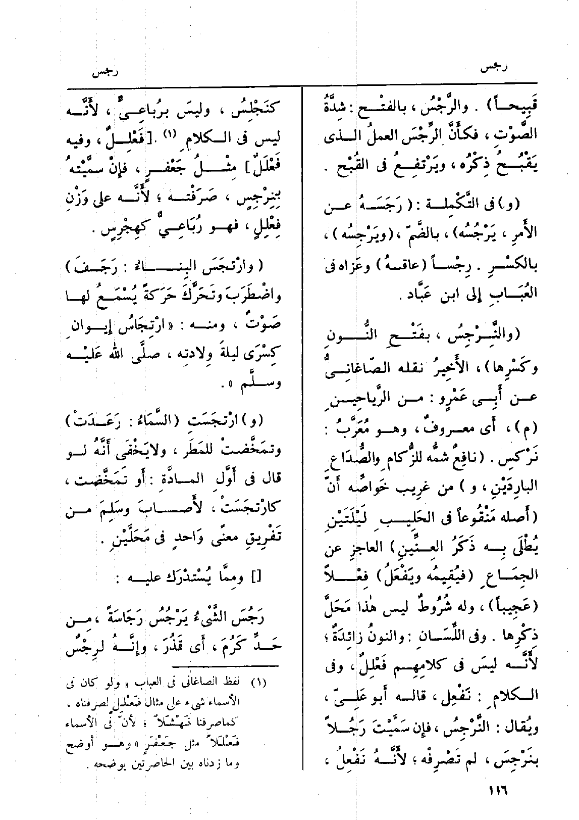 قَبِيحاً. والرَّجْسُ، بالفتْح: شِدَّةُ الصَّوْتِ، فكأَنَّ الرِّجْسَ العملُ الَّذِي يَقْبُح ذِكْرُه، ويَرْتفِعُ فِي القُبْح. وَفِي التَّكْمِلة: رَجَسَهُ عَن الأَمِر، يَرْجُسُه، بالضَّمِّ، ويَرْجِسُه، بالكَسْرِ. رِجْساً عاقهُ وعَزاه فِي العُبَابِ إِلى ابْن عَبَّاد. والنَّرْجِسُ، بفَتْحِ النُّونِ وكَسْرِها، الأَخِيرُ نَقله الصّاغَانِيُّ عَن أَبِي عَمْرٍ و: من الرَّياحِينِ م، أَي معروفٌ، وَهُوَ مُعَرَّبُ: نَرْكسِ. نافِعٌ شمُّه للزُّكامِ والصُّدَاعِ البارِدَيْنِ، وَمن غِريب خَواصِّه أَنّ أَصله مَنْقُوعاً فِي الحَلِيبِ لَيْلَتَيْنِ يُطْلَى بِه ذَكَرُ العِنِّينِ العاجزِ عَن الجِمَاعِ فيُقِيمُه ويَفْعَلُ فِعْلاً عَجِيباً، وَله شُرُوطٌ لَيْسَ هَذَا مَحَلَّ ذِكْرِها. فِي اللِّسَانِ: والنونُ زائِدَةٌ، لأَنَّه ليسَ فِي كلامِهِم فَعْلِلٌ، وَفِي الكلامِ: نَفْعِل، قَالَه أَبو عَلِيّ، ويُقال: النَّرْجِسُ، فإِن سَمَّيْتَ رَجُلاً بنَرْجِسَ، لم تَصْرِفْه، لأَنَّهُ نَفْعِلُ، كنَجْلِسُ، وليسَ برُباعِيٍّ، لأَنَّه لَيْسَ فِي الكلامِ فَعْلِلٌ، وَفِيه فَعْلَلٌ مِثْلُ جَعْفرٍ، فإِنْ سمَّيْتهُ بِنِرْجِسٍ، صَرَفْته لأَنَّه على وَزْنِ فِعْلِلٍ، فَهُوَ رُبَاعِيٌّ كهِجْرِسٍ. وارْتجَسَ البِناءُ: رَجَفَ واضْطَرَبَ وتَحَرَّكَ حَرَكةً يُسْمَعُ لَهَا صَوْتٌ، وَمِنْه: ارْتِجَاسُ إِيوانِ كِسْرَى لَيْلَة وِلادتِه، صلَّى الله عَليْه وسلَّم. وارْتجَسَتِ السَّمَاءُ: رَعَدَتْ وتمَخَّضتْ للمَطرَ، وَلَا يَخْفَى أَنَّهُ لَو قَالَ فِي أَوَّلِ المادَّةِ: أَو تَمَخَّضت، كارْتجَسَتْ، لأَصابَ وسَلِمَ من تَفْرِيقِ معنى وَاحدٍ فِي مَحَلَّيْنِ. ومِمَّا يُسْتدْرَك عَلَيْهِ: رَجُسَ الشَّيْءُ يَرْجُسُ رَجَاسَةً، مِن حَدِّ كَرُمَ، أَي قَذُرَ وإِنَّهُ لرِجْسٌ