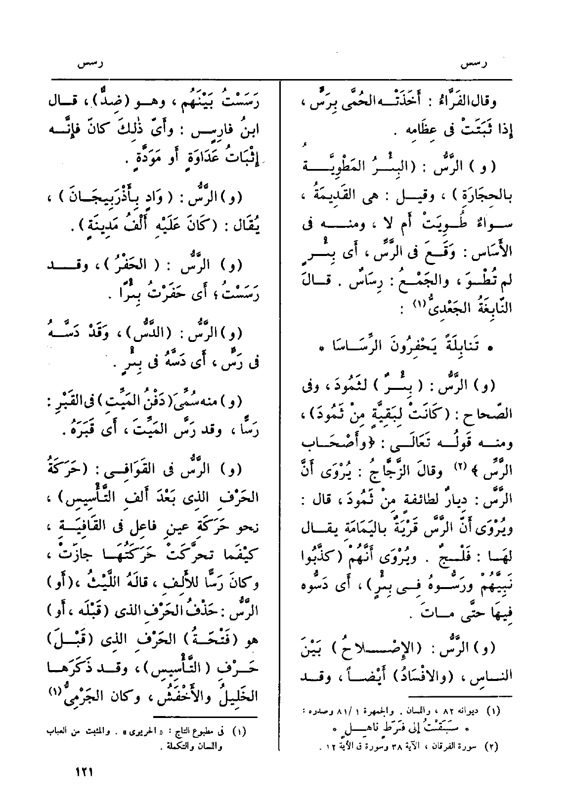 وَقَالَ الفَرَّاءُ: أَخَذَتْه الحُمَّى {بِرَسٍّ، إِذا ثَبَتَتْ فِي عِظَامِه.} والرَّسُّ: البِئْرُ المَطْوِيَّةُ بالحِجَارَةِ، وَقيل: هِيَ القَدِيمَةُ، سواءٌ طُوِيَتْ أَم لَا، وَمِنْه فِي الأسَاس: وَقَعَ فِي {الرَّسِّ، أَي بِئْرٍ لم تُطْوَ، والجَمْعُ:} رِسَاسٌ. قالَ النّابِغَةُ الجَعْدِيُّ: تَنابِلَةً يَحْفِرُونَ {الرِّسَاسَا} والرَّسُّ: بِئْرٌ لثَمُودَ، وَفِي الصّحاح: كَانَتْ لِبَقِيَّةٍ مِنْ ثَمُودَ، وَمِنْه قَولُه تَعَالَى: وأَصْحَاب {الرَّسِّ وقالَ الزَّجَّاجُ: يُرْوَى أَنَّ} الرَّسَّ: دِيارٌ لطائفةٍ مِنْ ثَمُودَ، قَالَ: ويُرْوَى أَنّ الرَّسَّ قَرْيَةٌ باليَمَامَةِ يُقَال لَها: فَلْجٌ. ويُرْوَى اَنَّهُمْ كذَّبُوا نَبِيَّهُمْ {ورَسُّوهُ فِي بِئْرٍ، أَي دَسُّوه فِيهَا حتَّى ماتَ.} والرَّسُّ: الإِصْلاحُ بَيْنَ الناسِ، والافْسَادُ أَيْضاً، وَقد {رَسَسْتُ بَيْنَهُم، وَهُوَ ضِدَّ، قَالَ ابنُ فارِسٍ: وأَيّ ذلِكَ كانَ فإِنَّه إِثْبَاتُ عَدَاوَةٍَأو مَوَدَّةٍ.} والرَّسُّ: وَادٍ بِأَذْرَبيجَانَ، يُقَال: كَانَ عَلَيْهِ أَلْفُ مَدِينَةٍ. والرَّسُّ: الحَفْرُ، وَقد رَسَسْتُ، أَي حَفَرْتُ بِئْراً. والرَّسُّ: الدَّسُّ، وَقَدْ دَسَّهُ فِي {رَسٍّ، أَي دَسَّهُ فِي بِئْرٍ.