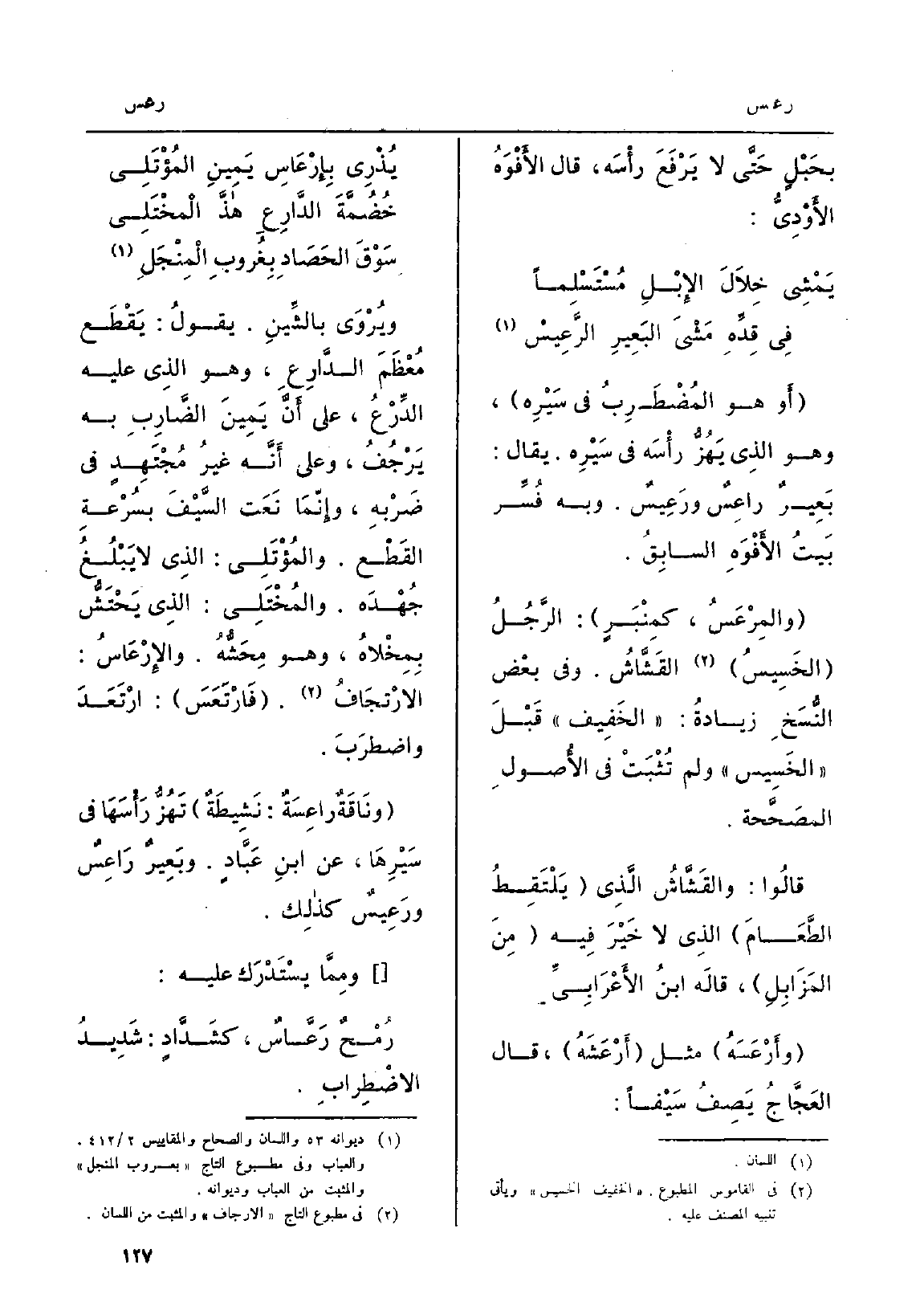 (يَمْشِي خِلاَلَ الإِبْلِ مُسْتَسْلِماً ... فِي قِدِّهِ مَشْيَ البَعِيرِ الرَّعِيسْ)