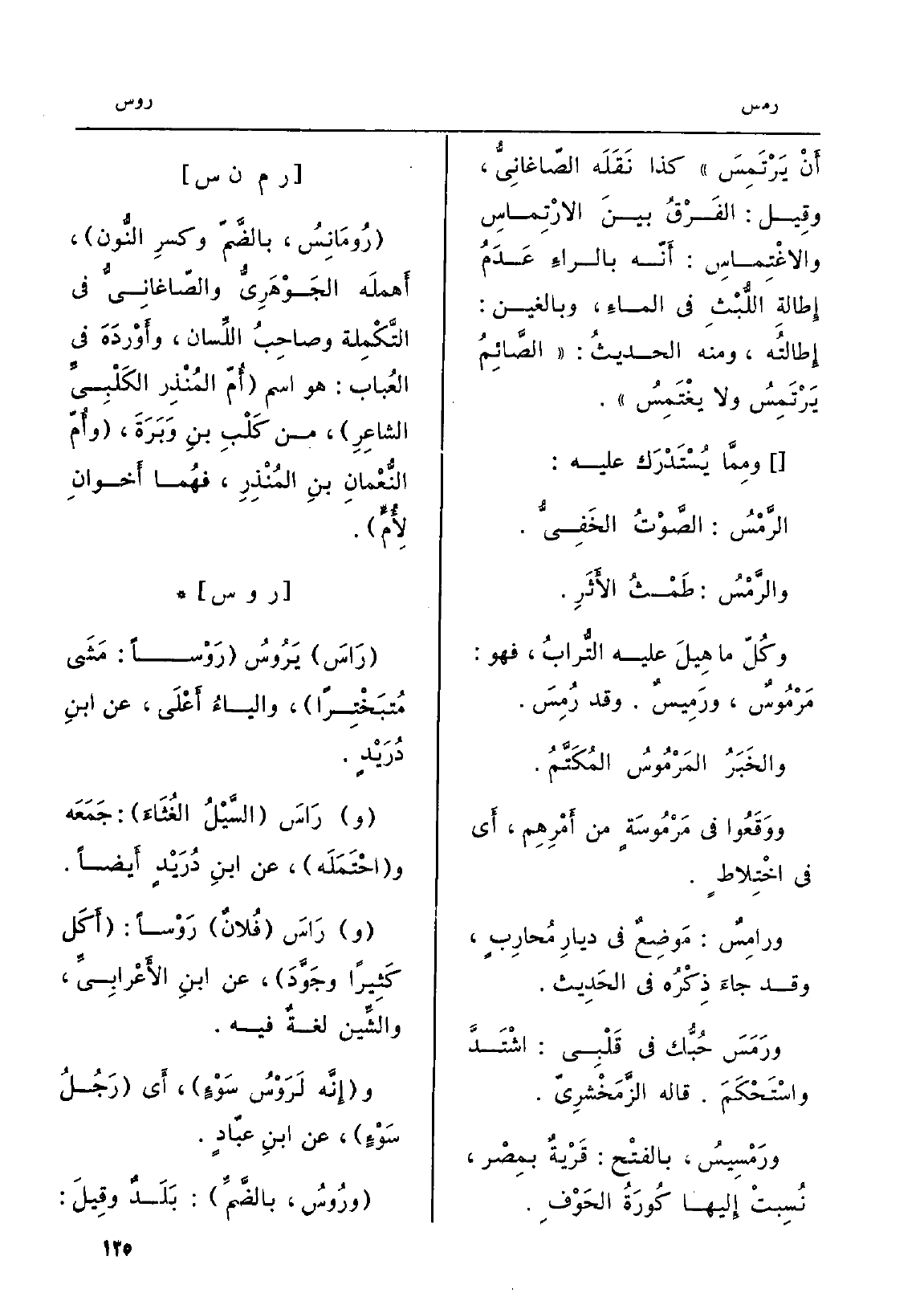 {رَاسَ} يَرُوسُ {رَوْساً: مَشَى مُتَبَخْتِراً، والياءُ أَعْلَى، عَن ابنِ دُرَيْدٍ. (و) } رَاسَ السَّيْلُ الغُثَاءَ: جَمَعَه واحْتَمَلَه، عَن ابنِ دُرَيْدٍ أَيضاً. (و) {رَاسَ فُلانٌ} رَوْساً: أَكَل كَثِيراً وجَوَّدَ، عَن ابنِ الأَعْرابِيِّ، والشِّين لغةٌ فِيهِ. وإِنَّهُ {لَرَوْسُ سَوْءٍ، أَي رَجُلُ سُوْءٍ، عَن ابنِ عبّادٍ.} ورُوسُ، بالضَّمِّ: بَلَدٌ وقِيلَ:
