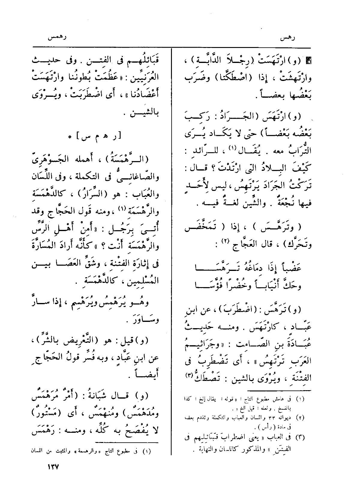 وارْتَهَسَ الجَرَادُ: رَكِبَ بعْضُه بَعْضاً حَتَّى لَا يَكَاد يُرَى التُّرَابُ مَعَه. يُقَال، للرّائدِ: كَيْفَ البِلادُ الَّتِي ارْتَدْتَ قَالَ: تَرَكْتُ الجَرَادَ يَرْتَهِسُ، لَيْسَ لأَحَدٍ فِيهَا نُجْعَةٌ. والشِّين لغةٌ فِيهِ. وتَرَهَّسَ، إِذا تَمَخَّضَ وتَحَرَّك، قَالَ العَجَّاج: عَضْباً إِذَا دِمَاغُهُ تَرَهَّسَا وحَكَّ أَنْيَاباً وخُضْراً فُؤَّسَا وتَرَهَّسَ: اضْطَرَب، عَن ابنِ عَبّادٍ، كارْتَهَسَ. وَمِنْه حَدِيثُ عُبَادَةَ بنِ الصّامِت: وجَرَاثِيمُ العَرَبِ تَرْتَهِسُ، أَي تَضْطَرِبُ فِي الفِتْنَةِ، ويُرْوَى بالشين: تَصْطَكُّ قَبَائِلُهم فِي الفِتن. وَفِي حَدِيث العُرَنِيِّين: عَظُمَتْ بُطونُنا وارْتَهَسَتْ أَعْضَادُنا، أَي اضْطَرَبَتْ، ويُرْوَى بالشين.
