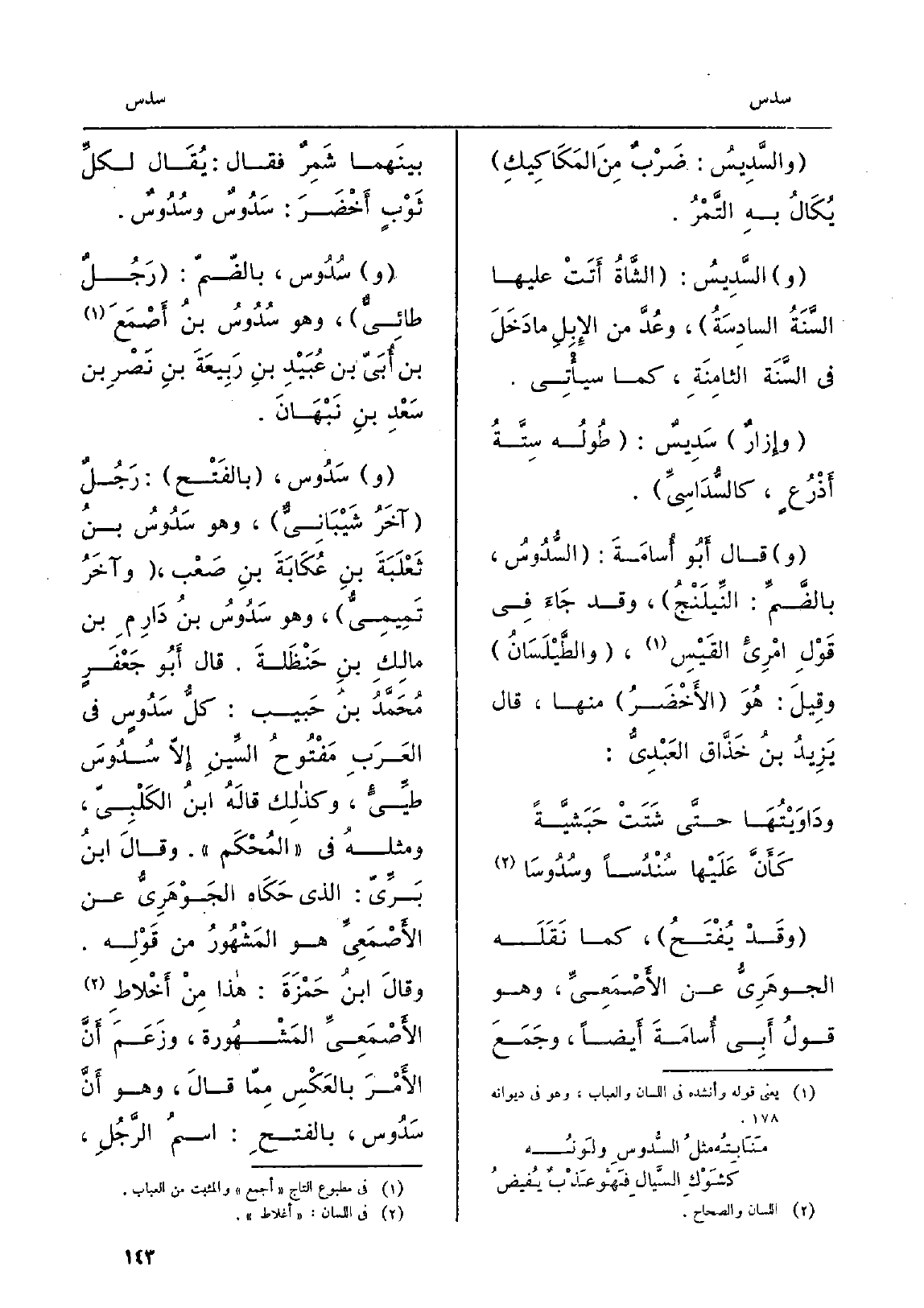 وقَدْ يُفْتَحُ، كَمَا نَقَلَه الجوهَرِيُّ عَن الأَصْمَعِيِّ، وَهُوَ قولُ أَبِي أُسامَةَ أَيضاً، وجَمَعَ بينَهما شَمِرٌ فَقَالَ: يُقال لكلِّ ثَوْبٍ أَخْضَرَ: سَدُوسٌ وسُدُوسٌ. وسُدُوس، بالضّمّ: رَجُلٌ طائِيٌّ، وَهُوَ سُدُوسُ بنُ أَصْمَعَ بن أُبَيّ بن عُبَيْدِ بنِ رَبِيعَةَ بنِ نَصْرِ بن سَعْدِ بنِ نَبْهَانَ. وسَدُوس، بالفَتْح: رَجُلٌ آخَرُ شَيْبَانِيٌّ، وه وسَدُوسُ بنُ ثَعْلَبَةَ بنِ عُكَابَةَ بنِ صَعْب، وآخَرُ تَمِيميُّ، وَهُوَ سَدُوسُ بنُ دَارِمِ بن مالِكِ بنِ حَنْظلَةَ. قَالَ أَبُو جُعْفَرٍ مُحَمَّدُ بنُ حَبيب: كلُّ سَدُوسٍ فِي العَرَبِ مَفْتُوحُ السِّينِ إلاّ سُدُوسَ طَيِّئٍ، وكذلِك قالَهُ ابنُ الكَلْبِيّ، ومثلهُ فِي المُحْكَم. وقالَ ابنُ بَرِّيّ: الَّذِي حَكَاه الجَوْهَرِيُّ عَن الأَصْمَعِيِّ هُوَ المَشْهُورُ من قَوْلِه. وقالَ ابنُ حَمْزَةَ: هَذَا مِنْ أَخْلاطِ الأَصْمَعِيِّ المَشْهُورة،)