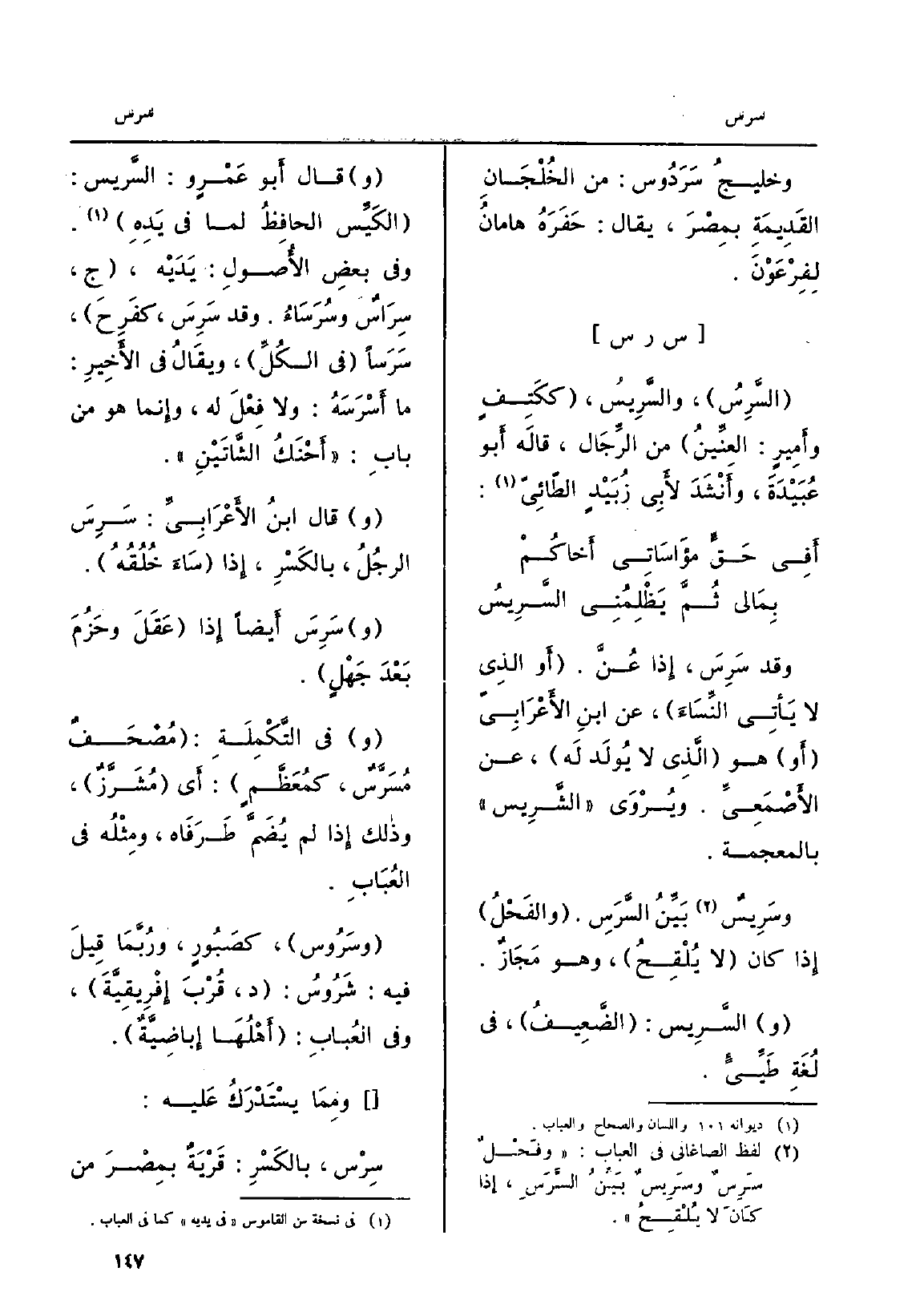 السَّرِسُ، والسَّرِيسُ، ككَتِفٍ وأَميرٍ: العِنِّينُ من الرِّجَال، قالَه أَبو عُبَيْدََ، وأَنْشَدَ لأَبِي زُبَيْدٍ الطّائِيّ: