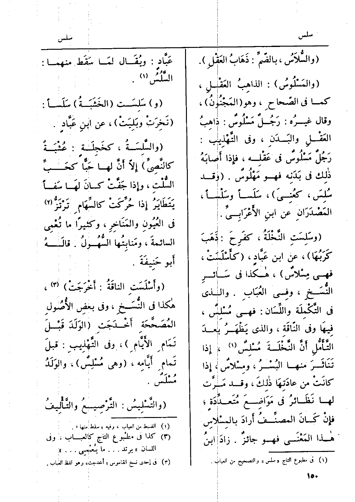 والسُّلاَسُ، بالضّمِّ: ذَهَابُ العَقْلِ. والمَسْلُوسُ: الذاهِبُ العَقْلِ، كَمَا فِي الصّحاحِ، وَهُوَ المَجْنُونُ، وَقَالَ غيرُه: رَجُلٌ مَسْلُوسٌ: ذاهِبُ العَقْلِ والبَدَنِ، وَفِي التَّهْذِيب: رَجُلٌ مَسْلُوسٌ فِي عَقْلِه، فإِذا أَصابَهُ ذلِك فِي بَدَنِه فَهُوَ مَهْلُوسٌ. وَقد سُلِسَن كعُنِيَ، سَلَساً وسَلْساً، المَصْدَرَانِ عَن ابنِ الأَعْرَابِيِّ. وسَلِسَتِ النَّخْلَةُ، كفَرِحَ: ذَهَبَ كَرَبُهَا، عَن ابْن عَبَّادٍ، كأَسْلَسَتْ، فَهِيَ مِسْلاسٌ، هَكَذَا فِي سَائرِ النُّسَخِ، وفِي العُبَابِ. وَالَّذِي فِي التَّكْمِلَة والِّلسَان: فَهِيَ مُسْلِسٌ، فِيَها وَفِي النّاقَةِ، وَالَّذِي يَظْهَرُ بعدَ التَّأَمُّلِ أَنَّ النَّخْلَةَ مُسْلِسٌ، إِذا تَنَاثَرَ مِنْهَا البُسْرُ، ومِسْلاسٌ، إِذا كانَتْ من عادَتِهَا ذلِكَ، وَقد مَرَّت لَهَا نَظَائرُ فِي مَوَاضِعَ مُتَعدِّدَةٍ فإِنْ كَانَ المصنِّفُ أَرادَ بالمِسْلاَسِ هَذَا المَعْنَى فَهُوَ جائزٌ. زادَ ابنُ عَبَّادٍ: ويُقَال لمَا سَقَطَ مِنْهُمَا: السَّلُسُ. وسَلِسَت الخَشَبَةُ سَلَساً: نَخِرَتْ وبَلِيَتْ، عَن ابنِ عَبَّادٍ: والسَّلِسَةُ، كخَجِلَةٍ: عُشْبَةٌ كالنَّصِيِّ إِلاَّ أَنَّ لَهَا حَبًّا كحَبِّ السُّلْتِ، وإِذا جَفَّتْ كانَ لَها سَفاً يَتَطَايَرُ إِذا حُرِّكَتْ كالسِّهَامِ تَرْتَزُّ فِي العُيُونِ والمَنَاخِرِ، وَكَثِيرًا مَا تُعْمِي السائمةَ، ومَنابِتُها)