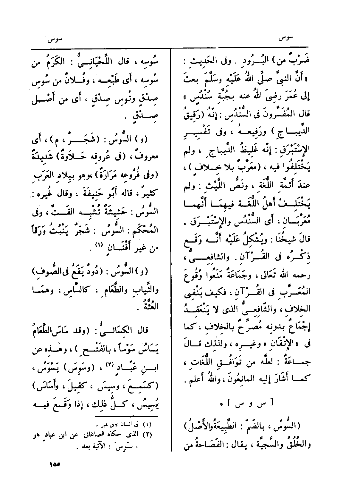 والسُّوسُ: شَجَرٌ، م، أَي معروفٌ، فِي عُروقِه حَلاَوةٌ شَدِيدَةٌ وَفِي فُرُوعِه مَرَارَةٌ، وَهُوَ ببِلادِ العَرَبِ كثيرٌ، قَالَه أُبُو حَنِيفَةَ، وَقَالَ غيرُه: السُّوسُ: حَشِيشَةٌ تُشْبِه القَتَّ، وَفِي المُحْكَم: السُّوسُ: شَجَرٌ يَنْبُتُ وَرَقاً من غير أَفْنَانٍ.