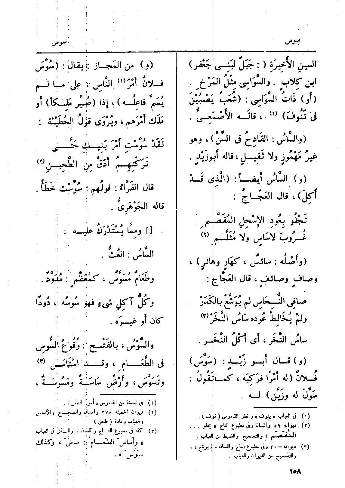 السينِ الأَخِيرَةِ: جَبَلٌ لبنِي جَعْفر ابْن كِلابٍ. {- والسَّوَاسِي مِثْلُ المَرْخِ. أَو ذَاتُ السَّوَاسِي: شُعَبٌ يَصْبُبْنَ فِي تَنُوفَ، قالَه الأَصْمَعِيُّ.} والسَّاسُ: القَادِحُ فِي السِّنِّ، وَهُوَ غيرُ مَهْمُوزٍ وَلَا ثَقِيلٍ، قَالَه أَبو زَيْدٍ. (و) {السَّاسُ أَيضاً: الَّذِي قَدْ أُكِلَ، قَالَ العَجّاجُ: