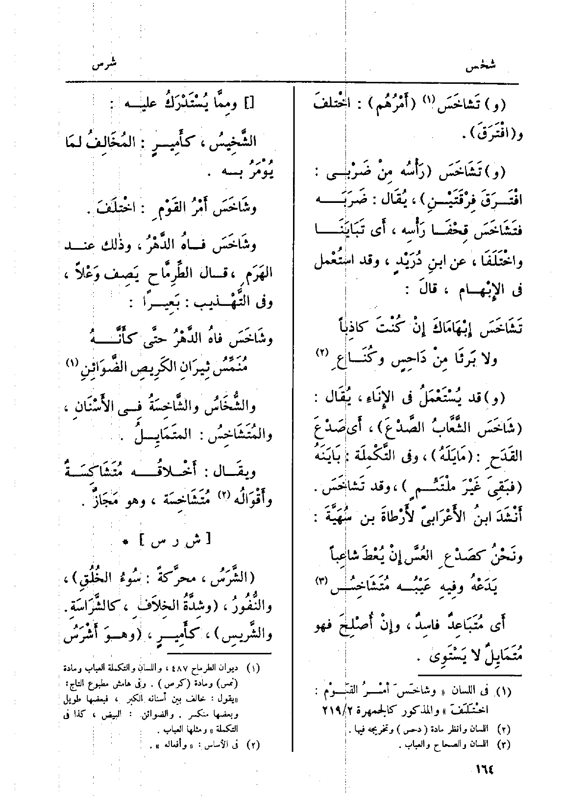 ) أَي مُتَبَاعِدٌ فاسِدٌ، وإِنْ أُصْلِحَ فَهُوَ مُتَمَايِلٌ لَا يَسْتَوِي. ومِمَّا يُسْتَدْرَكُ عَلَيْهِ: الشَّخِيسُ، كأَمِيرٍ: المُخَالِفُ لمَا يُوْمَرُ بِهِ. وشَاخَسَ أَمْرُ القَوْمِ: اخْتلَفَ. وشَاخَسَ فاهُ الدَّهْرُ، وَذَلِكَ عِنْد الهَرَمِ، قَالَ الطِّرِمَّاح يَصِف وَعْلاً، وَفِي التَّهْذيب: بَعِيراً: