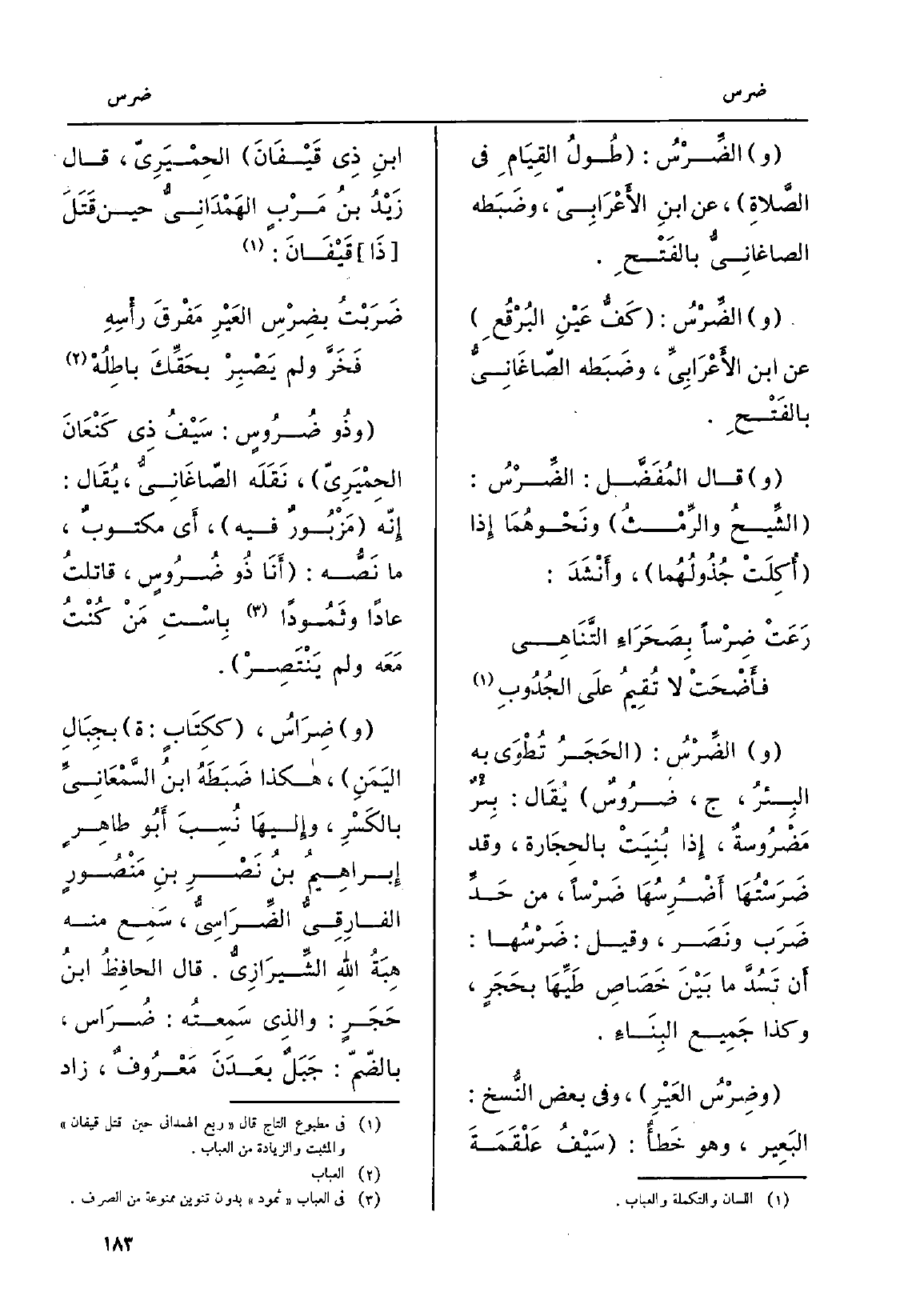 والضَّرْسُ: الحَجَرُ تُطْوَى بِهِ البِئرُ، ج، ضرُوسٌ يُقَال: بِئْرٌ مَضْرُوسةٌ، إِذا بُنِيَتْ بالحِجَارة، وَقد ضَرَسْتُهَا أَضْرُسُهَا ضَرْساً، من حَدِّ ضَرَب ونَصَر، وَقيل: ضَرْسُها: أَن تَسُدَّ مَا بَيْنَ خَصَاصِ طَيِّهَا بحَجَرٍ، وَكَذَا جَمِيع البِنَاءِ. وضِرْسُ العَيْرِ، وَفِي بعض النُّسخ: البَعِير، وَهُوَ خَطأٌ: سَيْفُ عَلْقَمَةَ ابنِ ذِي قَيْفَانَ الحِمْيَرِيّ، قَالَ زَيْدُ بنُ مَرْبٍ الهَمْدَانِيُّ حِين قَتَلَ ذَا قَيْفَانَ: