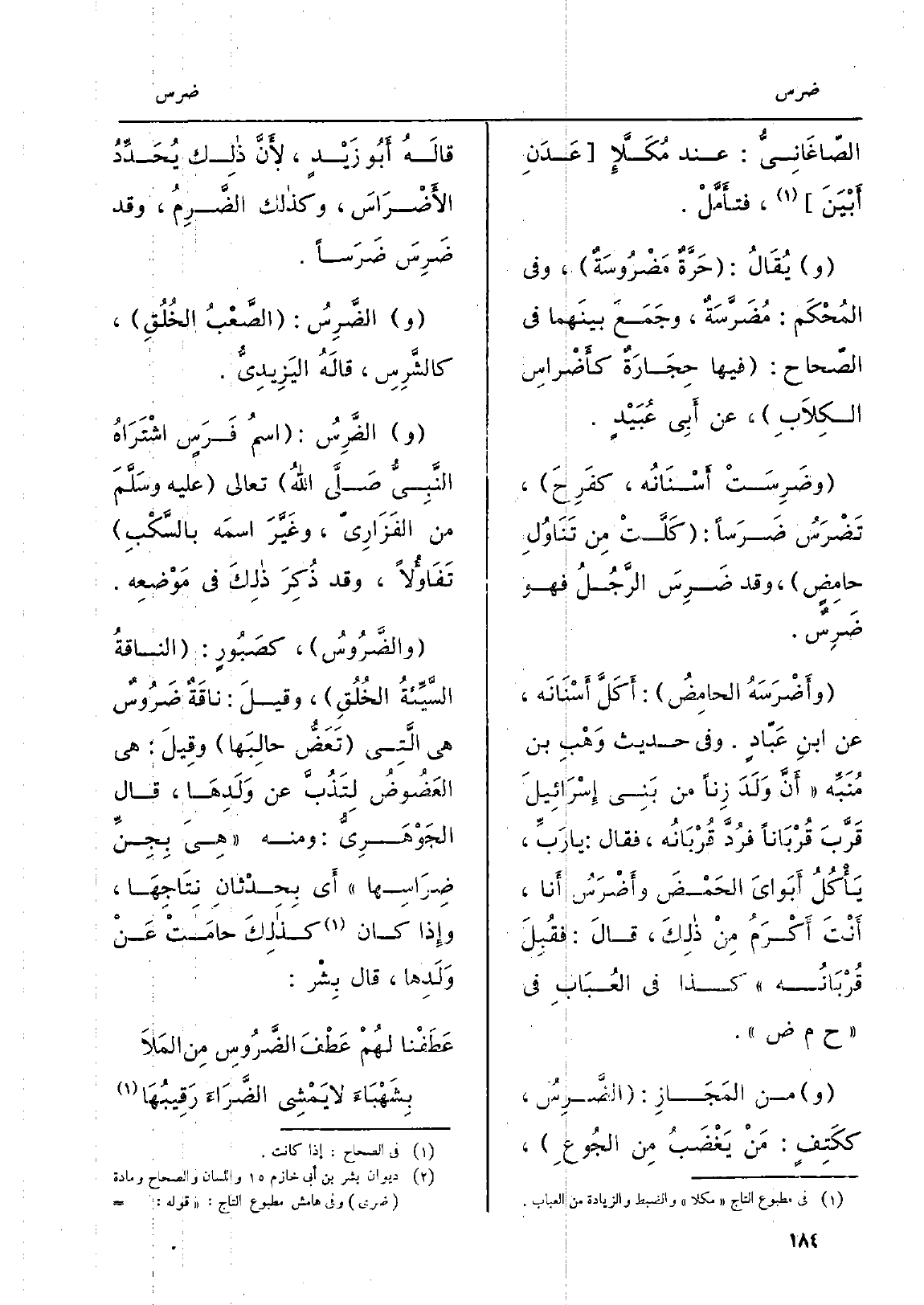 الصّاغَانِيُّ: عِنْد مُكَلإ عَدَنِ أَبْيَنَ، فتأَمَّلْ. ويُقَالُ: حَرَّةٌ مَضْرُوسَةٌ، وَفِي المُحْكَم: مُضَرَّسَةٌ، وجَمَعَ بينَهما فِي الصّحاح: فِيهَا حِجَارَةٌ كأَضْراسِ الكِلاَبِ، عَن أَبِي عُبَيْدٍ. وضَرِسَتْ أَسْنَانُه، كفَرِحَ، تَضْرَسُ ضَرَساً: كَلَّتْ مِن تَنَاوُلِ حامِضٍ، وَقد ضَرِسَ الرَّجُلُ الرَّجُلُ فَهُوَ ضَرِسٌ. وأَضْرَسَهُ الحامِضُ: أَكَلَّ أَسْنَانَه، عَن ابنِ عَبّادٍ. وَفِي حَدِيث وَهْبِ بن مُنَبِّه أَنَّ وَلَدَ زِناً من بَنِي إِسْرائِيلَ قَرَّبَ قُرْبَانُه فرُدَّ قَرْبَانُه، فَقَالَ: يَا رَبِّ، يَأْكُلُ أَبَوايَ الحَمْضَ وأَضْرَسُ أَنا، أَنْتَ أَكْرَمُ مِنْ ذلِكَ، قالَ: فقُبِلَ قَرْبَانُه كَذَا فِي العُبَابِ فِي ح م ض. وَمن المَجَازِ: الضَّرِسُ، ككَتِفٍ: مَنْ يَغْضَبُ مِن الجُوعِ، قالَهُ أَبُو زَيْدٍ، لأَنَّ ذلِك يُحَدِّدُ الأَضْرَاسَ، وَكَذَلِكَ الضَّرِمُ، وَقد ضَرِسَ ضَرَساً. والضَّرِسُ: الصَّعْبُ الخُلُقِ، كالشَّرِسِ، قالَهُ اليَزِيدِيُّ. والضَّرِسُ: اسمُ فَرَسٍ اشْتَرَاهُ النَّبِيُّ صَلَّى اللهُ تَعَالَى عَلَيْهِ وسَلَّمَ من الفَزَارِيّ، وغَيَّرَ اسمَه بالسَّكْبِ، تَفَاؤُلاً، وَقد ذًكِرَ ذلِكَ فِي مَوْضعِه. والضَّرُوسُ، كصَبُورٍ: الناقةُ السِّيِّئةُ الخُلُقِ، وقيلَ: ناقَةٌ ضَرُوسٌ هِيَ الَّتِي تَعَضُّ حالِبَها وقِيلَ: هِيَ العَضُوضُ لِتَذُبَّ عَن) وَلَدِهَا، قَالَ الجُوْهَرِيُّ: وَمِنْه هِيَ بِجِنِّ ضِرَاسِها، أَي بِحِدْثانِ نِتَاجِهَا، وإِذا كَانَ كذلِكَ حامَتْ عَنْ وَلَدِها، قَالَ بِشْر: