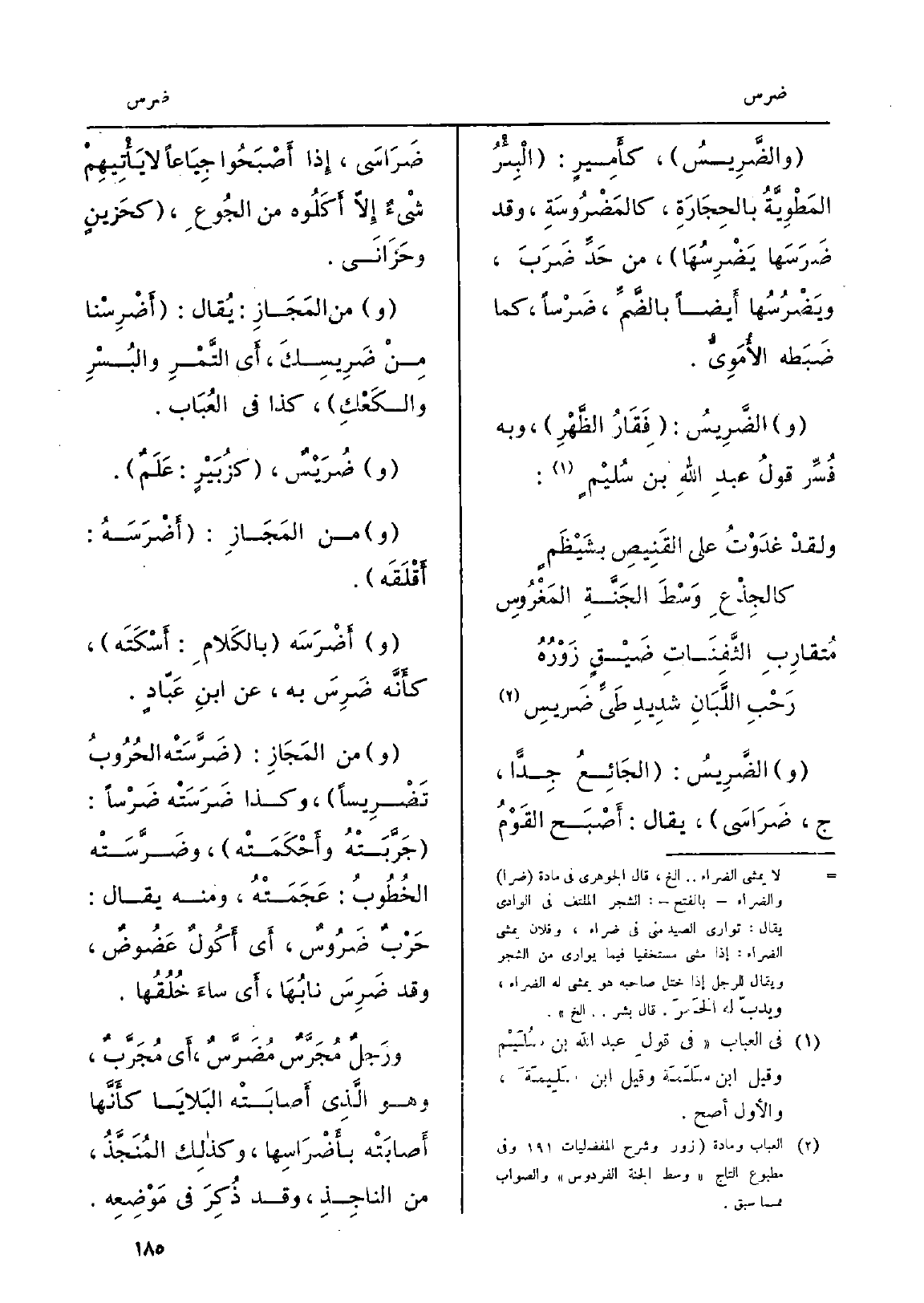 والضَّرِيسُ، كأَمِيرٍ: الْبِئْرُ المَطْوِيَّةُ بالحِجَارَةِ، كالمَضْرُوسَةِ، وَقد ضَرَسَها يَضْرِسُهَا، من حَدِّ ضَرَبَ، ويَضْرُسُها أَيضاً بالضَّمِّ، ضَرْساً، كَمَا ضَبَطه الأُمَوِيُّ. والضَّرِيسُ: فِقَارُ الظَّهْرِ، وَبِه فُسِّر قولُ عبدِ اللهِ بن سُليْمٍ: