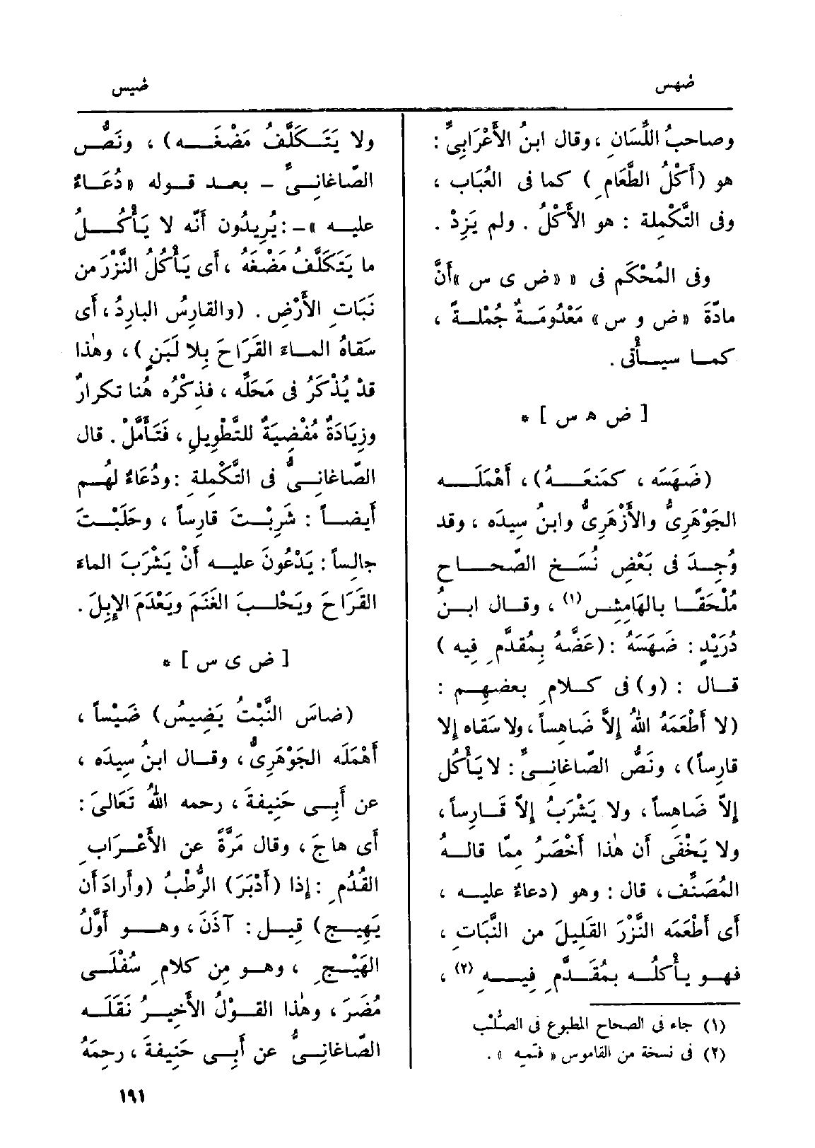 ُ وصاحبُ اللِّسَانِ، وَقَالَ ابنُ الأَعْرَابِيِّ: هُوَ أَكْلُ الطَّعَامٍ كَمَا فِي العُبَاب، وَفِي التَّكْمِلة: هُوَ الأَكْلُ. وَلم يَزِدْ. وَفِي المُحْكَم فِي ض ي س أَنَّ مادّةَ ض وس مَعْدُومَةٌ جُمْلةً، كَمَا سيأْتي