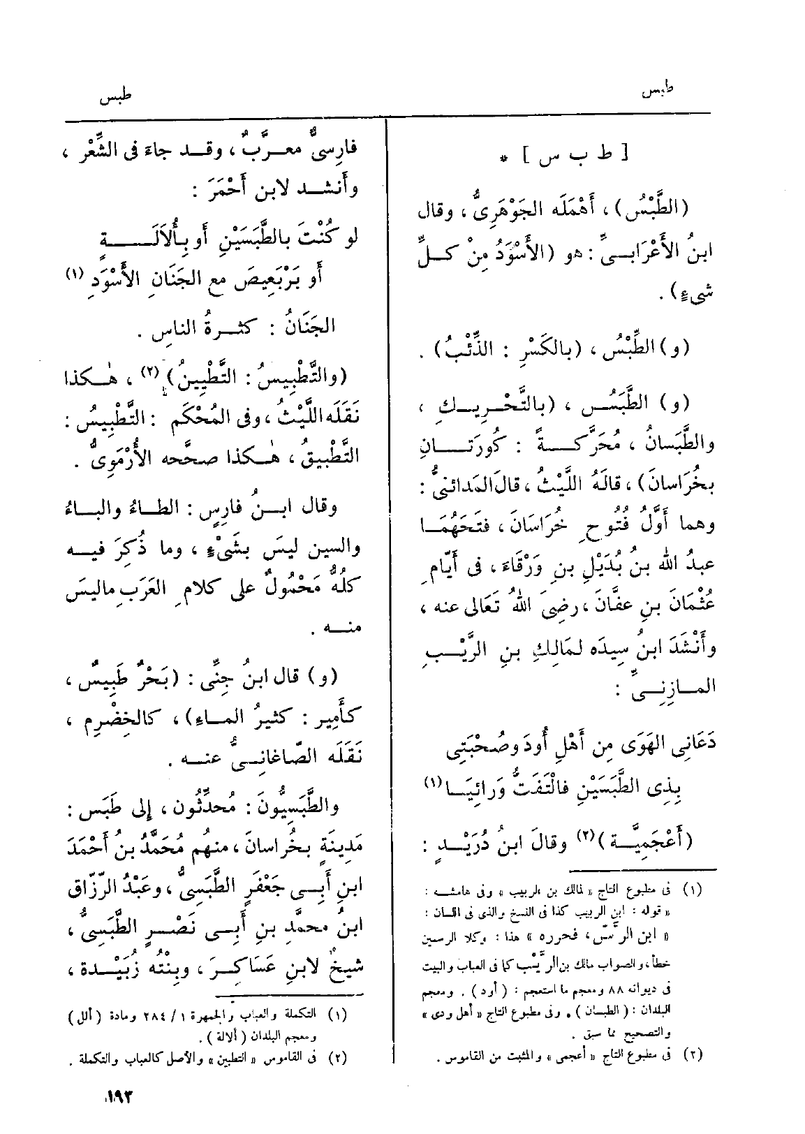 الجَنَانُ: كثرةُ الناسِ. والتَّطْبِيسُ: التَّطْيِينُ، هَكَذَا نَقَلَه اللَّيْثُ، وَفِي المُحْكَم: التَّطْبِيسُ: التَّطْبِيقُ، هَكَذَا صحَّحه الأُرْمَوِيُّ. وَقَالَ ابنُ فارِسٍ: الطاءُ والباءُ وَالسِّين ليسَ بشَيْءٍ، وَمَا ذُكِرَ فِيهِ كُلُّه مَحْمُولٌ على كلامِ العَرَبِ مَا ليسَ مِنْهُ. وَقَالَ ابنُ جِنِّى: بَحْرٌ طَبِيسٌ، كأَمِير: كثيرُ الماءِ، كالخِضْرِم، نَقَلَه الصّاغانِيُّ عَنهُ. والطَّبَسِيُّونَ: مُحدِّثُون، إِلى طَبَس: مَدِينَةٍ بخُراسانَ، منهُم مُحَمَّدُ بنُ أَحْمَدَ ابنِ أَبِي جَعْفَرٍ الطَّبَسِيُّ، وعَبْدُ الرّزّاق ابنُ محمَّدِ بنِ أَبِي نَصْرٍ الطَّبَسِيُّ، شيخٌ لابنِ عَسَاكِرِ، وبِنْتُه زُبَيْدة،