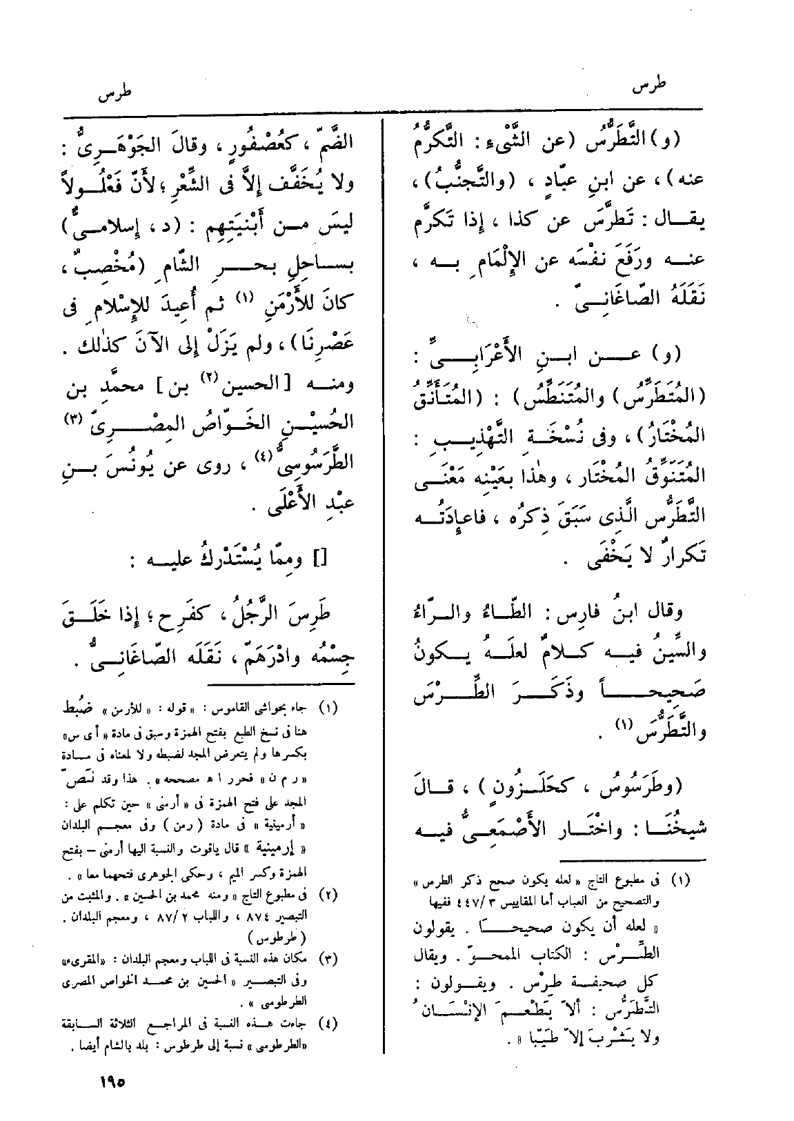 والتَّطَرُّسُ عَن الشَّيْءِ: التَّكرُّمُ عَنهُ، عَن ابنِ عبّادٍ، والتَّجنُّبُ، يُقَال: تَطرَّسَ عَن كَذَا، إِذا تَكرَّم عَنهُ ورَفَع نفْسَه عَن الإِلْمَامِ بِهِ، نَقَلَه الصّاغَانِيّ. وَعَن ابنِ الأَعْرَابِيِّ: المُتَطَرِّسُ والمُتَنَطِّسُ: المُتَاَنِّقُ المُخْتَارُ، وَفِي نُسْخَهِ التَّهْذِيبِ: المُتَنَوِّقُ المُخْتَار، وَهَذَا بعَيْنِه مَعْنَى التَّطَرُّس الَّذِي سَبَقَ ذِكرُه، فإعاِدَتُه تَكرارٌ لَا يَخْفَى. وَقَالَ ابنُ فارِس: الطّاءُ والرّاءُ والسِّينُ فِيهِ كلامٌ لعلَهُ يكونُ صَحِيحاً وذَكَرَ الطِّرْسَ والتَّطَرُّسَ. وطَرَسُوسُ، كحَلَزْونٍ، قالَ شيخُنَا: واخْتَار الأَصْمَعِيُّ فِيهِ الضَّمّ، كعُصْفُورٍ، وقالَ الجُوْهَرِيُّ: وَلَا يُخَفَّف إِلاَّ فِي الشِّعْرِ، لأَنّ فَعْلُولاً ليسَ من أَبْنيَتِهِم: د، إِسلاميٌّ بساحِلِ بحرِ الشّامِ مُخْصِبٌ، كانَ للأَرْمَنِ ثمَّ أُعِيدَ للإِسْلامِ فِي عَصْرِنَا، وَلم يَزَلْ إِلى الآنَ كَذَلِك. وَمِنْه الْحُسَيْن بن محمَّدِ بن الحُسيْنِ الخَوّاصُ المِصْرِيّ الطَّرَسُوسِيُّ، روى عَن يُونُسَ بنِ عبْدِ الأَعْلَى. ومِمّا يُسْتَدْركُ عَلَيْهِ: طَرِسَ الرَّجُلُ، كفَرِح إِذا خَلَقَ جِسْمُه وادْرَهَمّ، نَقَلَه الصّاغَانِيُّ.