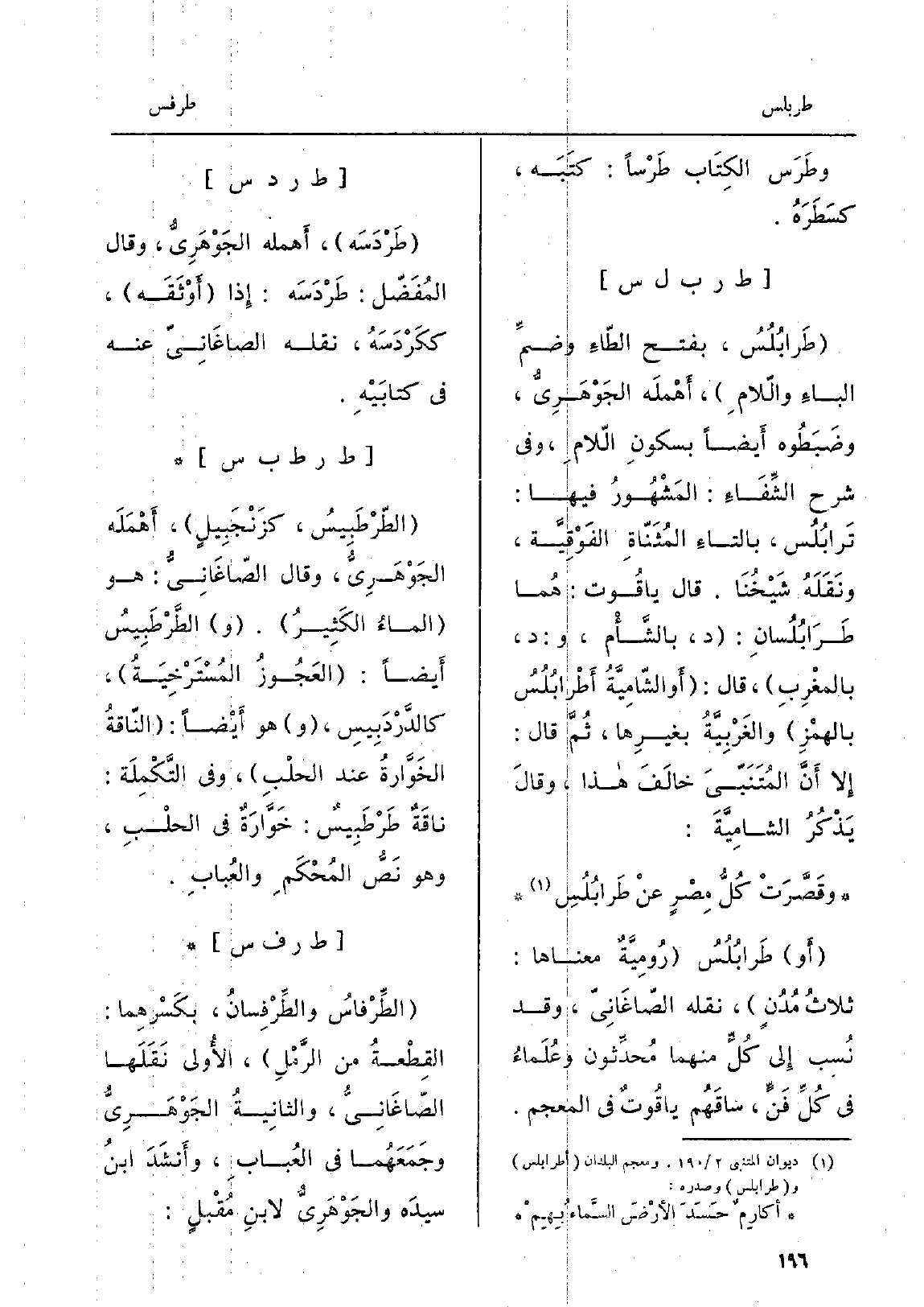 طَرابُلُسُ: بِفَتْح الطّاءِ وضمِّ الباءِ والّلامِ، أَهْملَه الجُوْهَرِيُّ، وضَبَطُوه أَيضاً بسكونِ الّلامِ، وَفِي شرح الشِّفَاءِ: المَشْهُورُ فِيهَا: تَرابُلُس، بالتاءِ المُثَنّاءِ الفَوْقِيَّة، ونَقَلَهُ شَيْخُنَا. قَالَ ياقُوت: هُما طَرَابُلُسانِ: د، بالشَّأْم، و: د، بالمغْرِبِ، قَالَ: أَو الشّامِيَّةُ أَطْرابُلُسُ بالهمْزِ والغَرْبِيَّةُ بغيرِها، ثُمَّ قَالَ: إِلاّ أَنَّ المُتَنَبّيَ خالَفَ هَذَا، وقالَ يَذْكُرُ الشامِيَّةَ: وقَصَّرَتْ كُلُّ مِصْرٍ عنْ طَرابُلُسِ أَو طَرابُلُسُ رُومِيَّةٌ مَعْنَاهَا: ثلاثُ مُدُنٍ، نَقله الصّاغَانِيّ، وَقد نُسب إِلى كُلِّ مِنْهُمَا مُحدِّثون وعُلَماءُ فِي كُلِّ فَنٍّ، ساقَهُم ياقُوتٌ فِي المعجم.